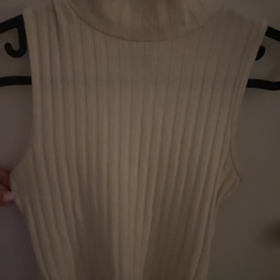 Säljer en vit ärmlös polotopp med ribbad struktur. Toppen är tight och har hög hals. Materialet känns mjukt och stretchigt, vilket gör den superbekväm. Första bilden är inte samma tröja men tröjan jag säljer sitter exakt som den!