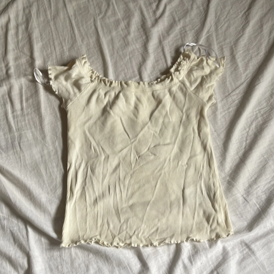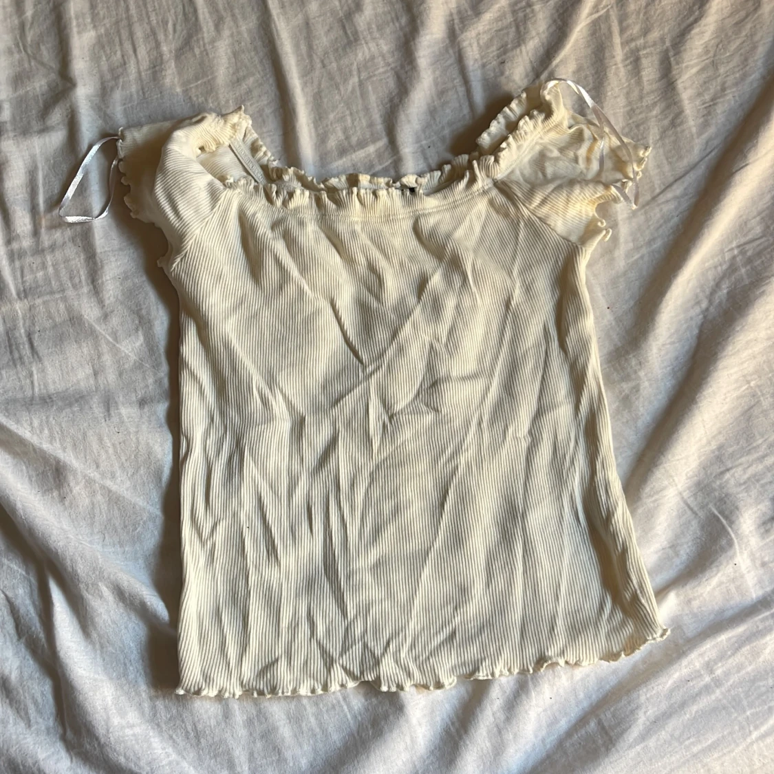 Säljer en söt vit ribbad topp med korta ärmar och volangdetaljer vid hals och ärmslut. Perfekt för sommardagar! 💫 ser liten ut men passar i S också, inte genomskinlig, priset kan diskuteras med kunden😁