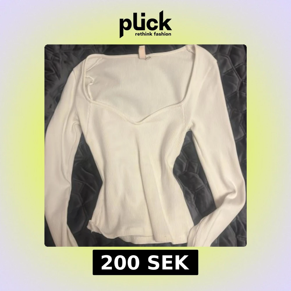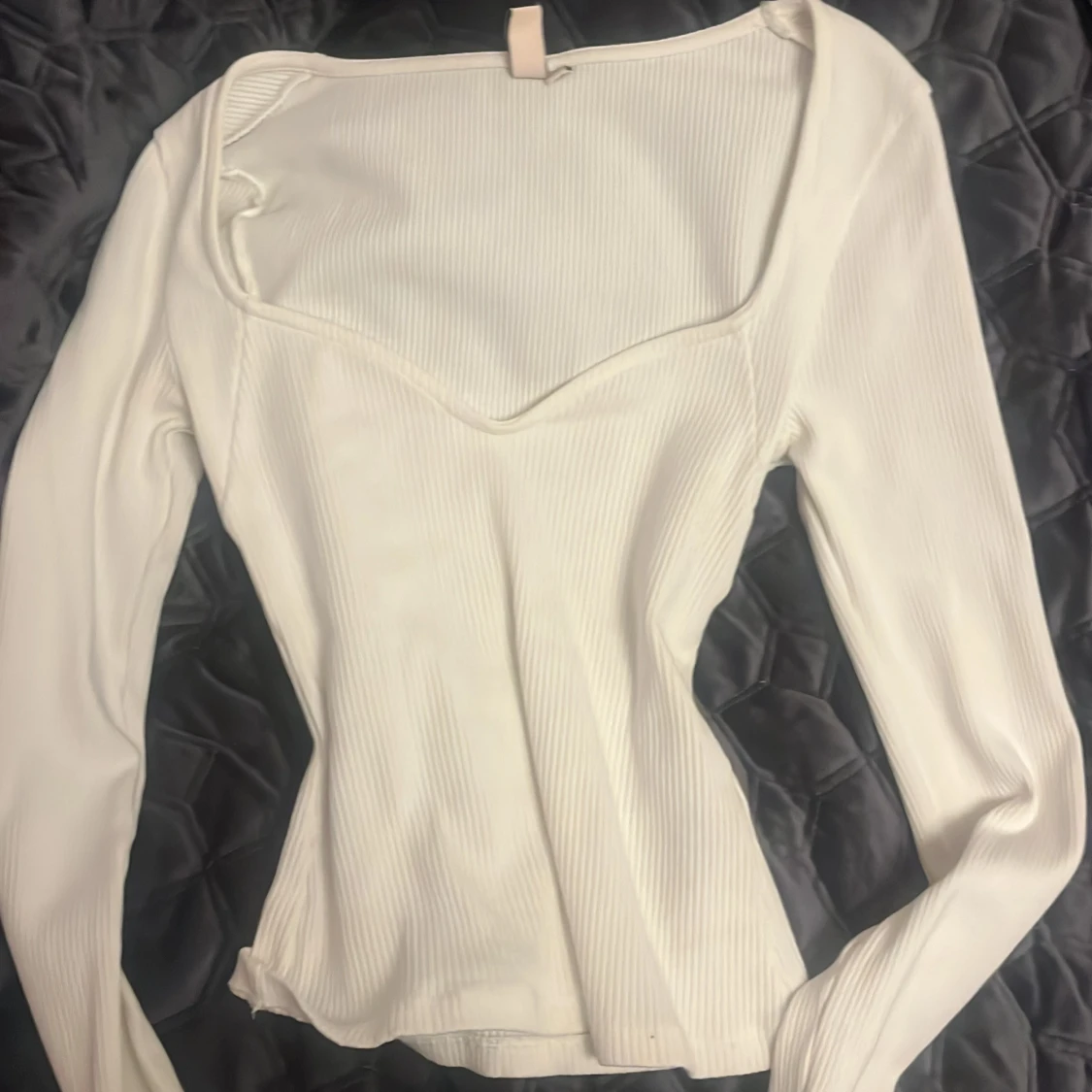 Säljer en stilren vit ribbad topp från Nelly med långärmad design och en elegant v-ringning.