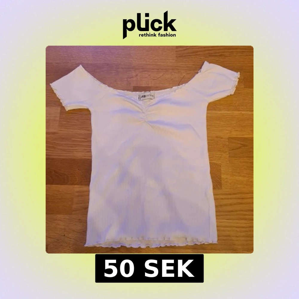 Snygg vit ribbad topp från Sisters Point med korta ärmar och en söt rynkdetalj framtill. Toppen har en offshoulder-design och vågiga kanter.