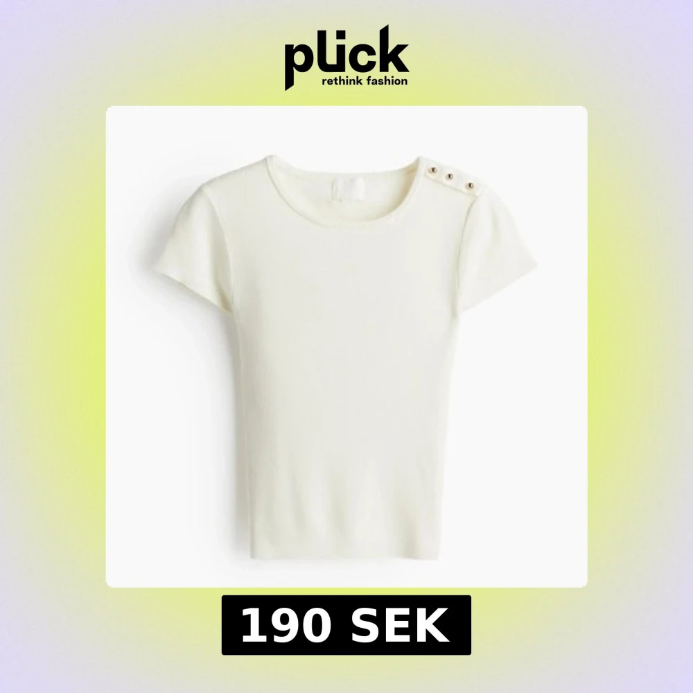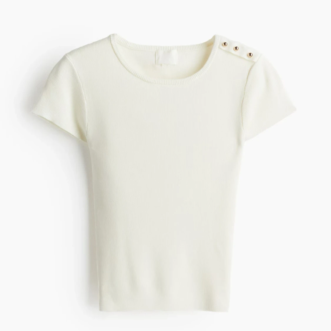 Superfräsch vit ribbad topp med korta ärmar och rund hals. Snygga guldfärgade knappar på ena axeln ger en extra detalj. Perfekt att styla med jeans eller kjol för en clean look.