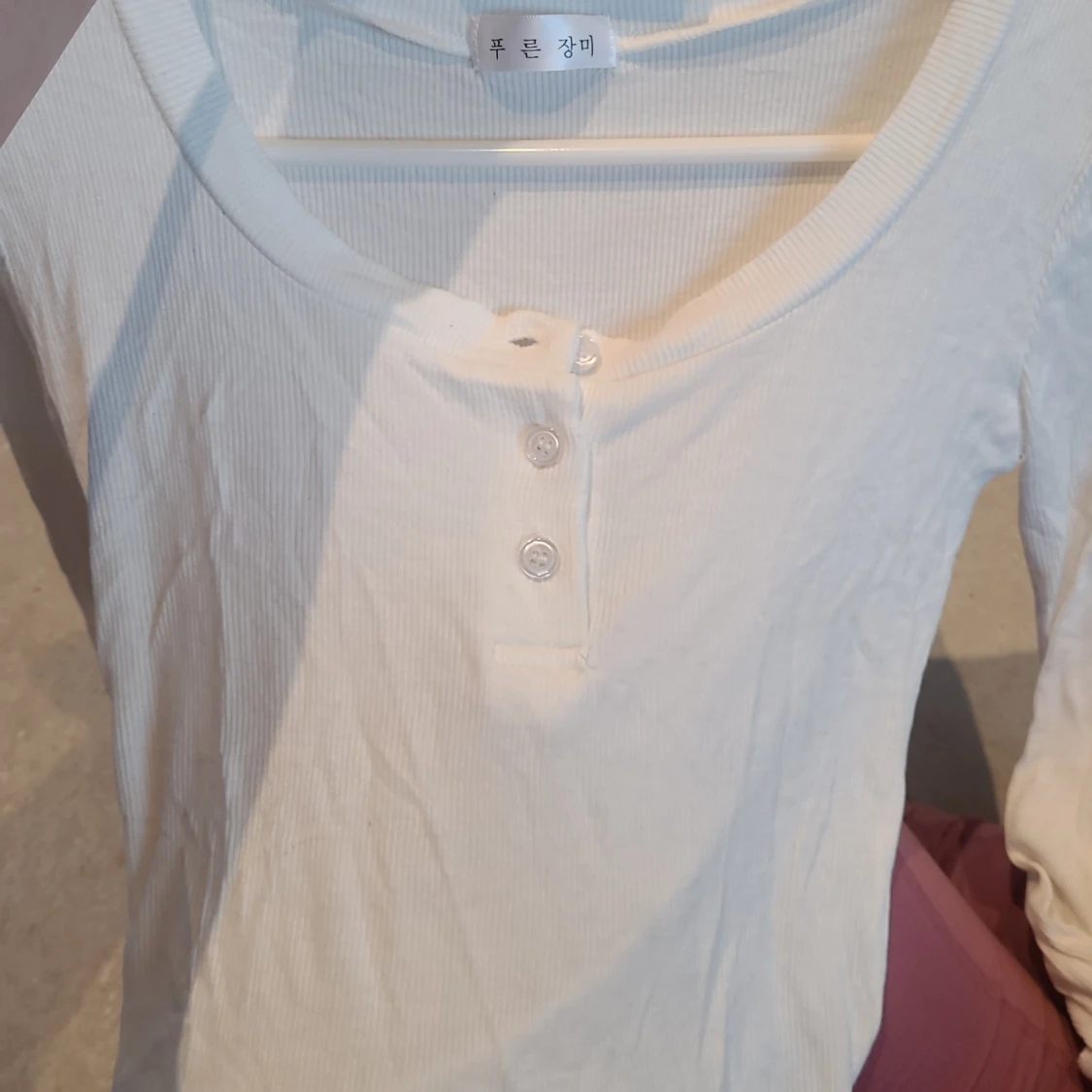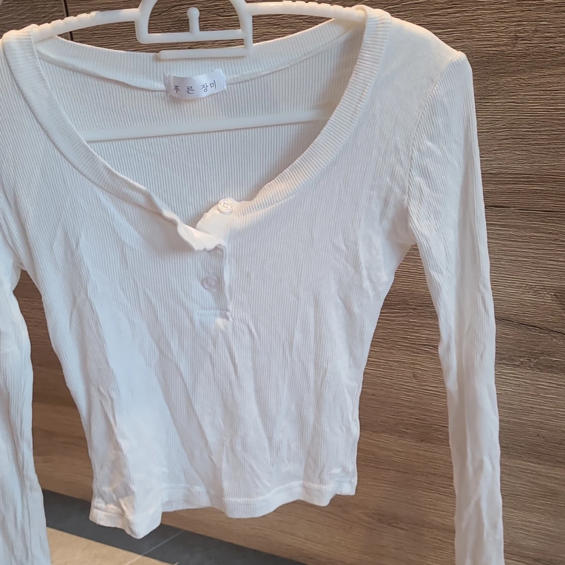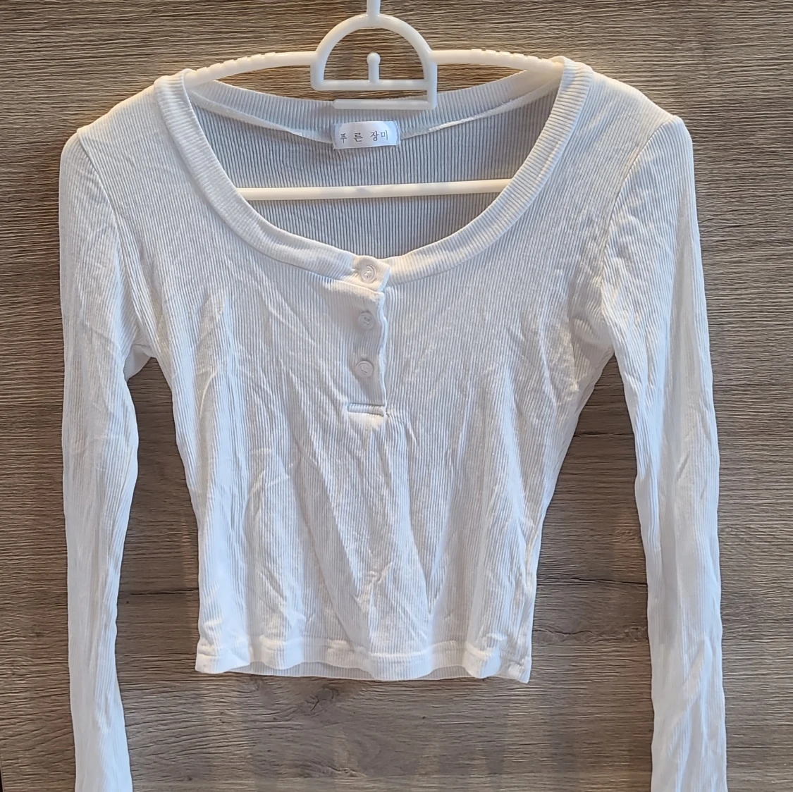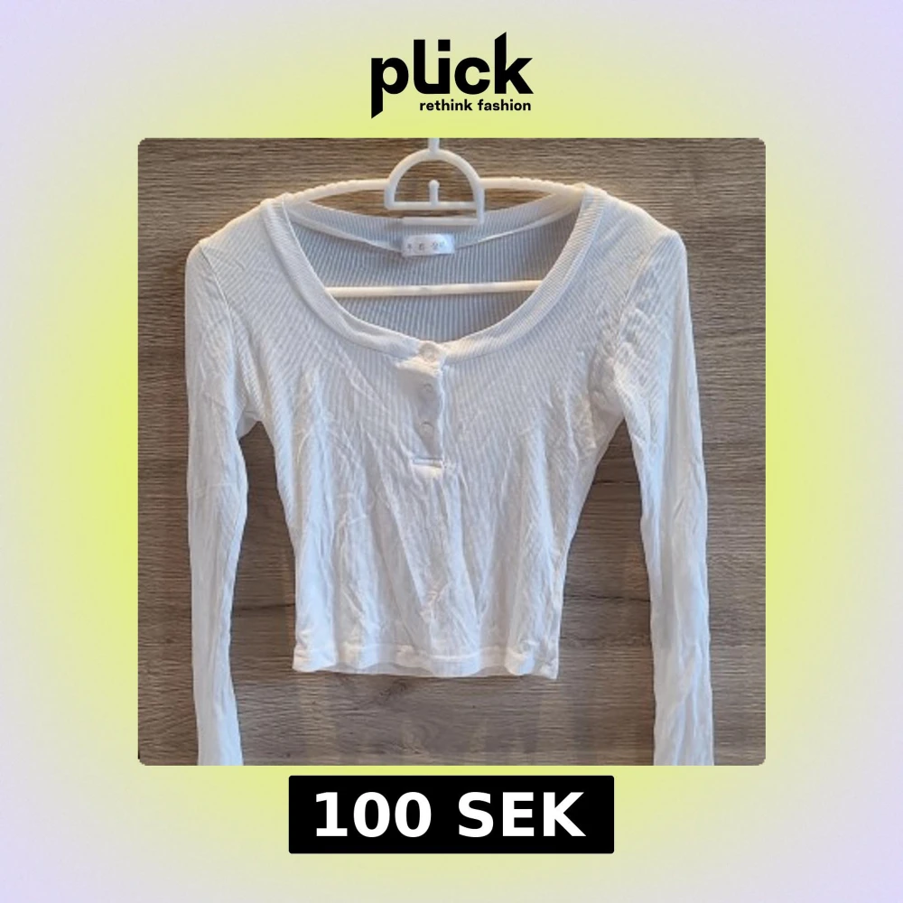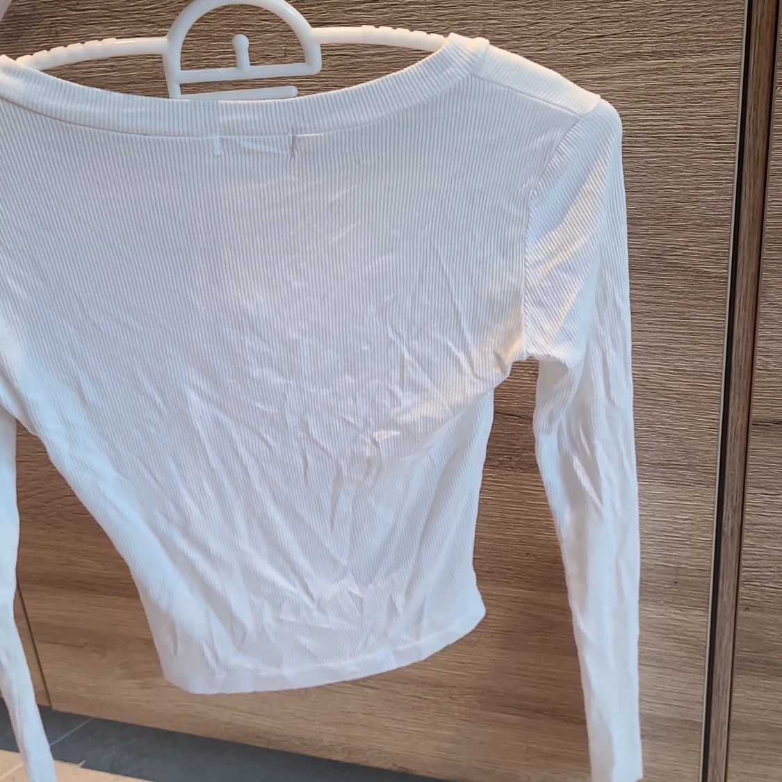 Jättesöt vit ribbad topp med lång ärm och knappar framtill. Tröjan är croppad och har en rund halsringning. Supermjukt och tunnt material. Köpt utomlands, gissar att strlken passar S, även XS. Aldrig använd