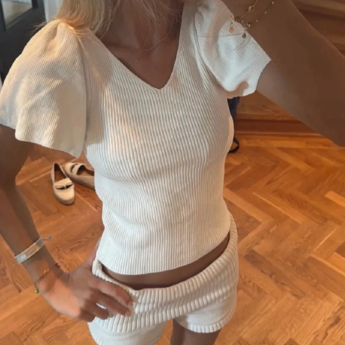 Superfin vit ribbad topp med v-ringning och korta puffärmar..
