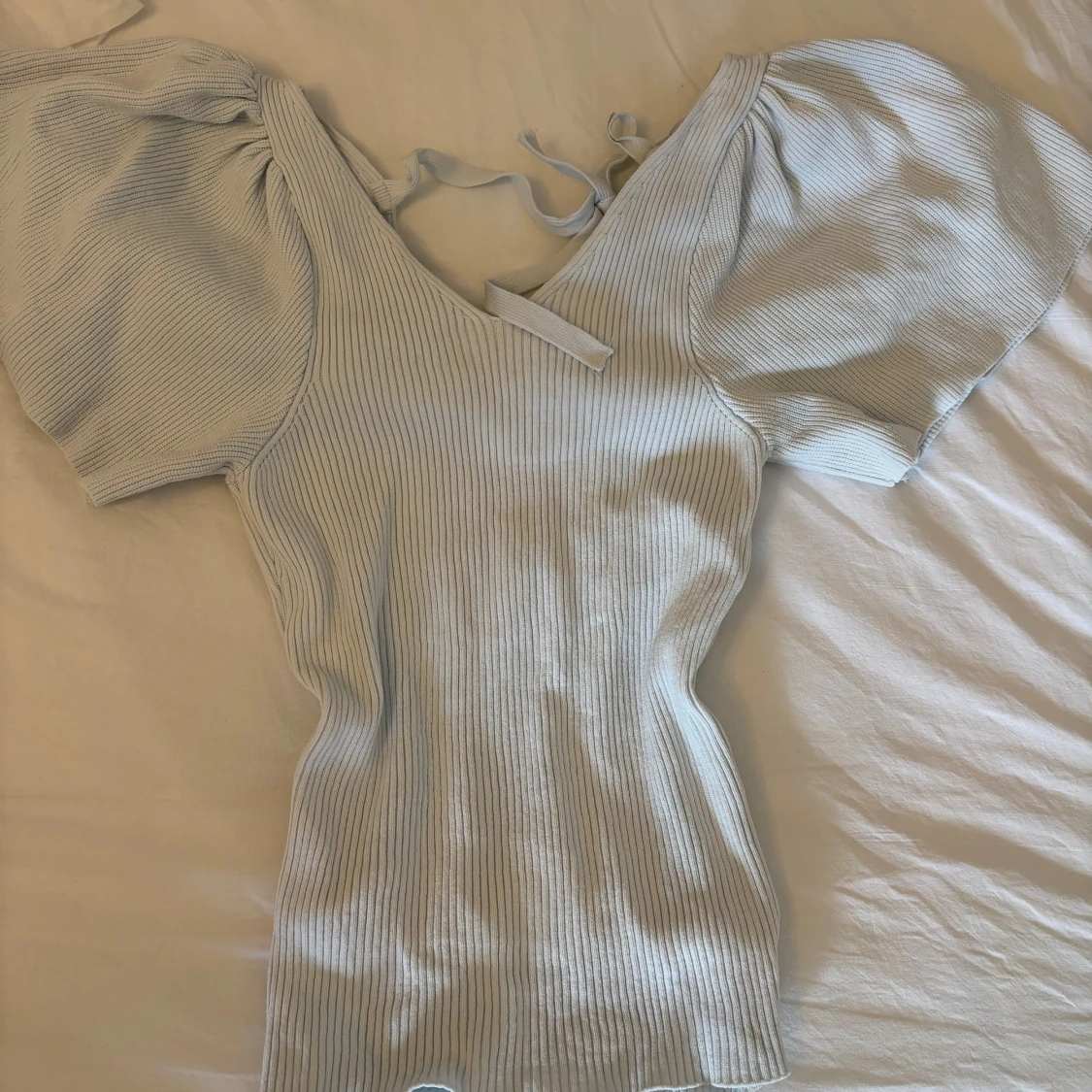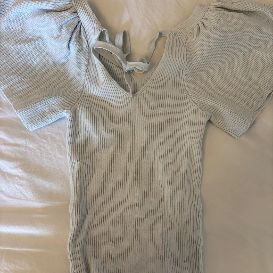 Supersöt vit ribbad topp med korta puffärmar och v-ringning. Toppen har knytband i nacken och är figurnära i passformen. Perfekt för dig som gillar en feminin och trendig stil med extra volym på axlarna.