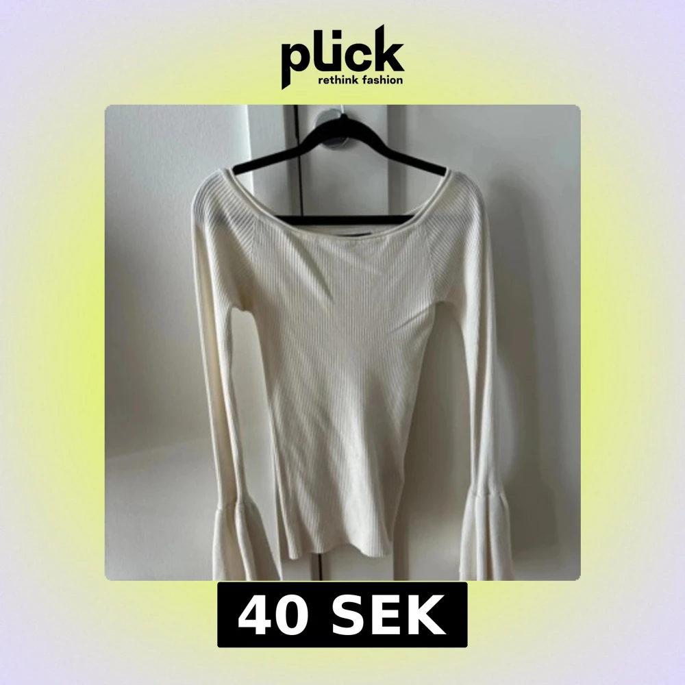 Säljer en vit ribbad topp med bred, rundad halsringning och långa trumpetärmar.