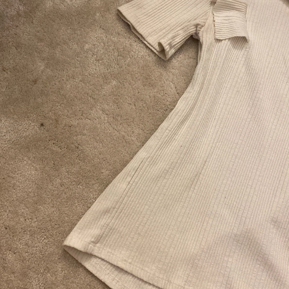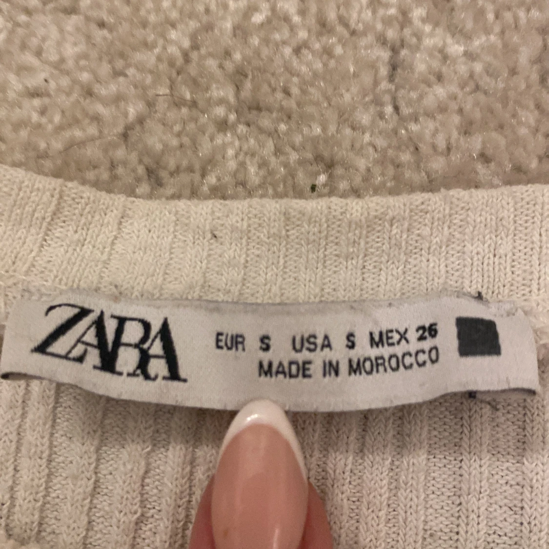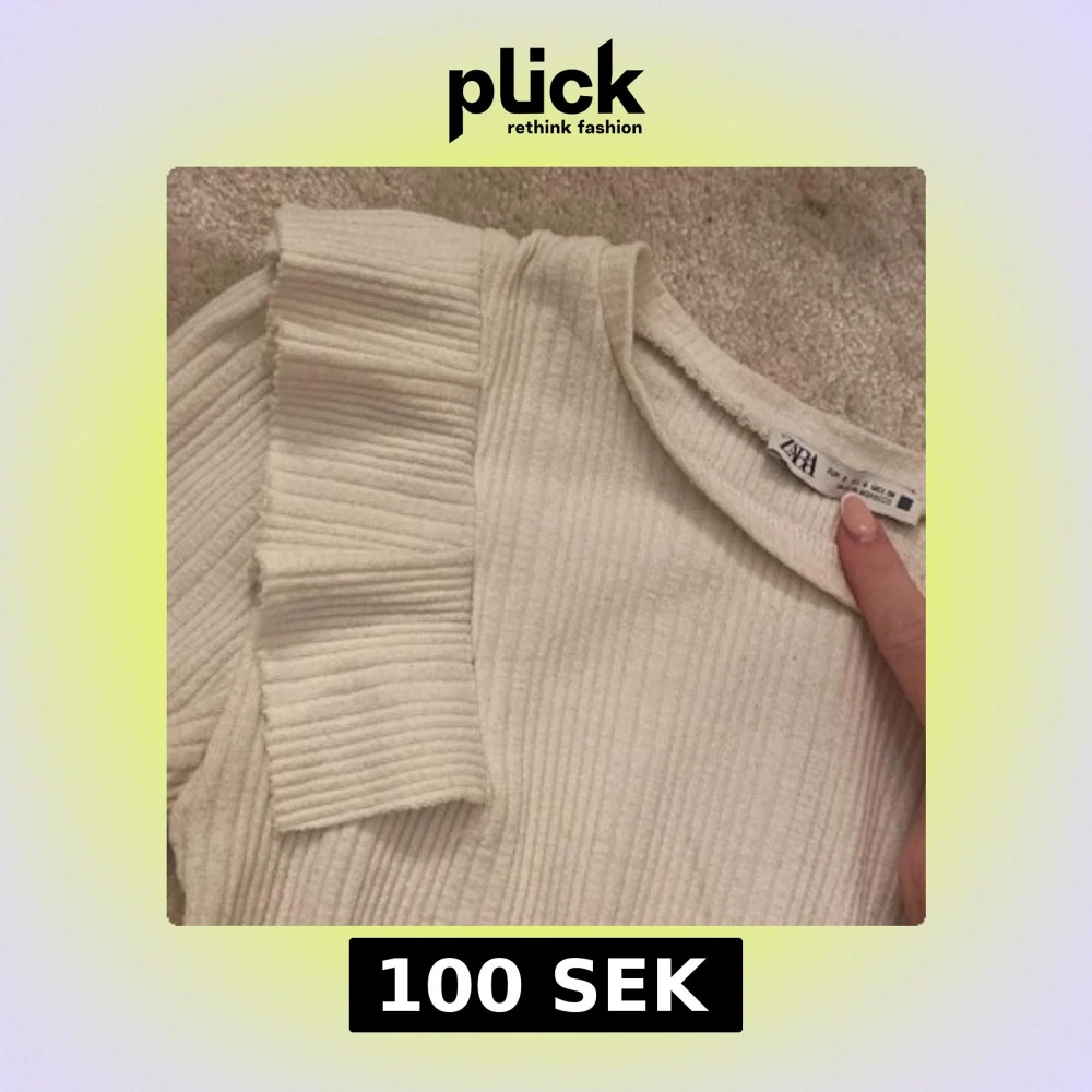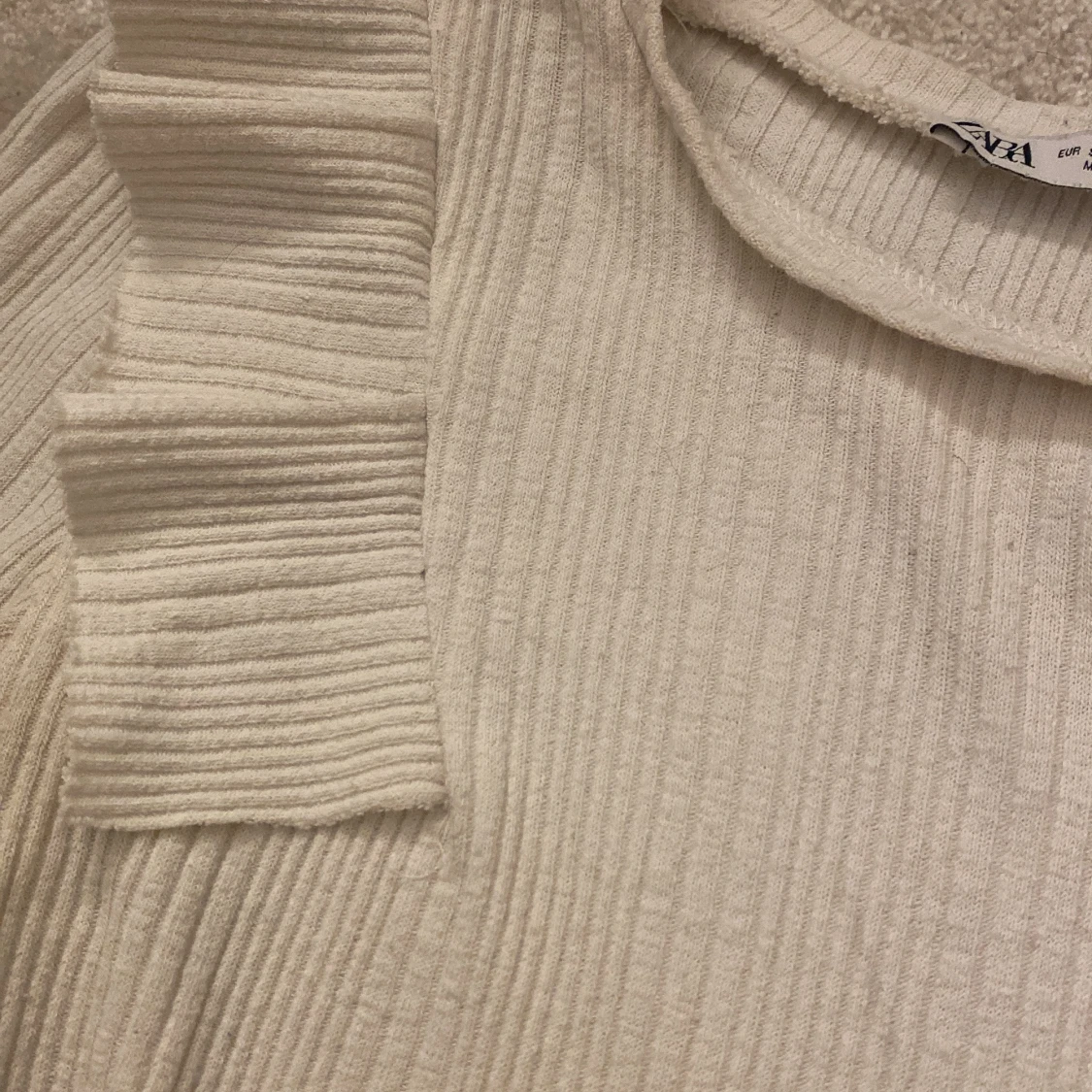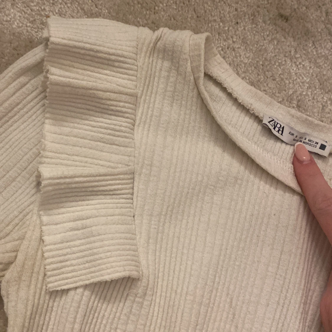 Säljer en vit ribbad topp från Zara i storlek S. Toppen har korta ärmar och en snygg volangdetalj på axeln som ger extra edge. Materialet är mjukt och stretchigt, perfekt för dig som gillar stilrena och coola plagg. Passformen är normal och toppen har rund hals.