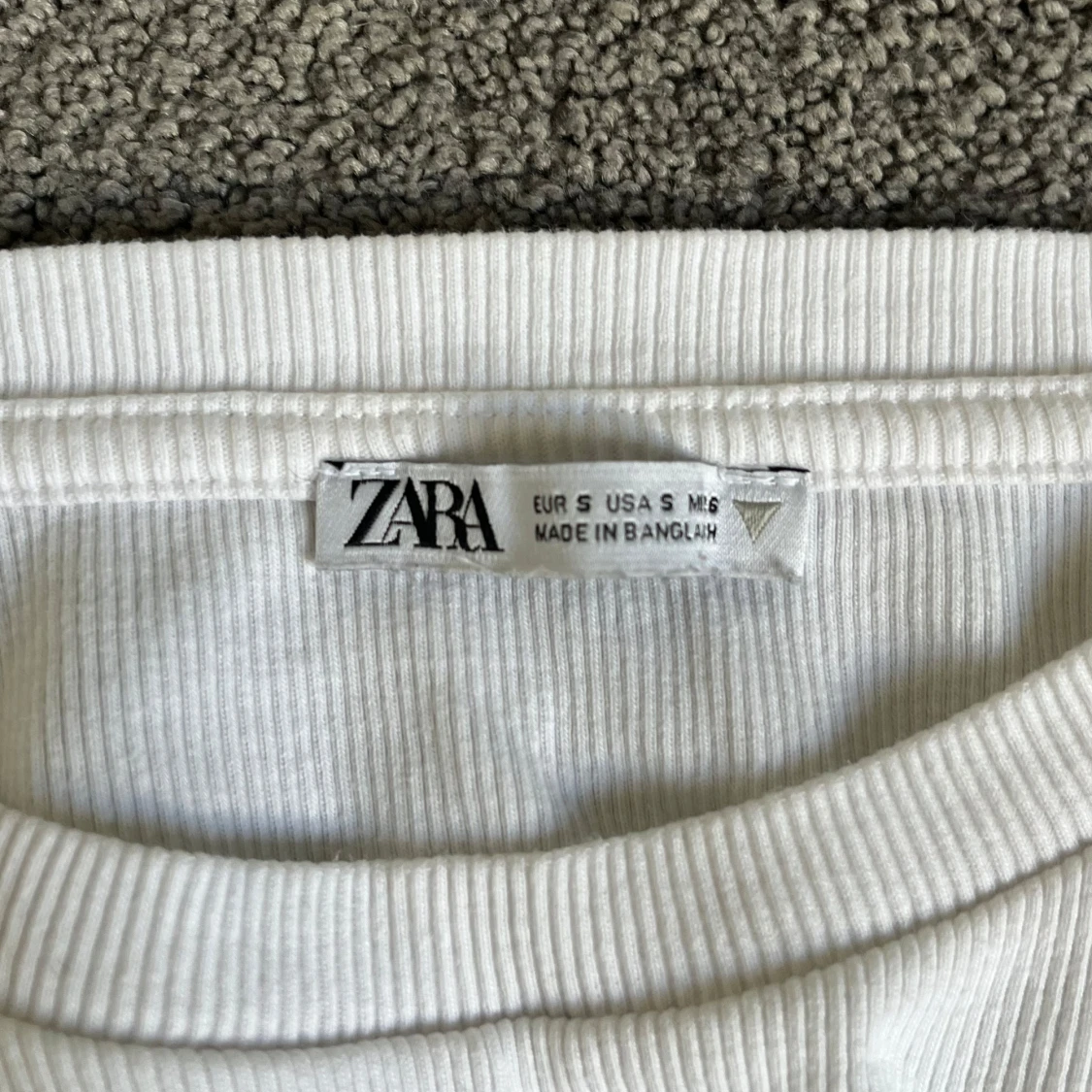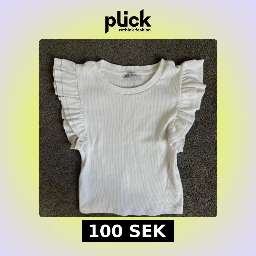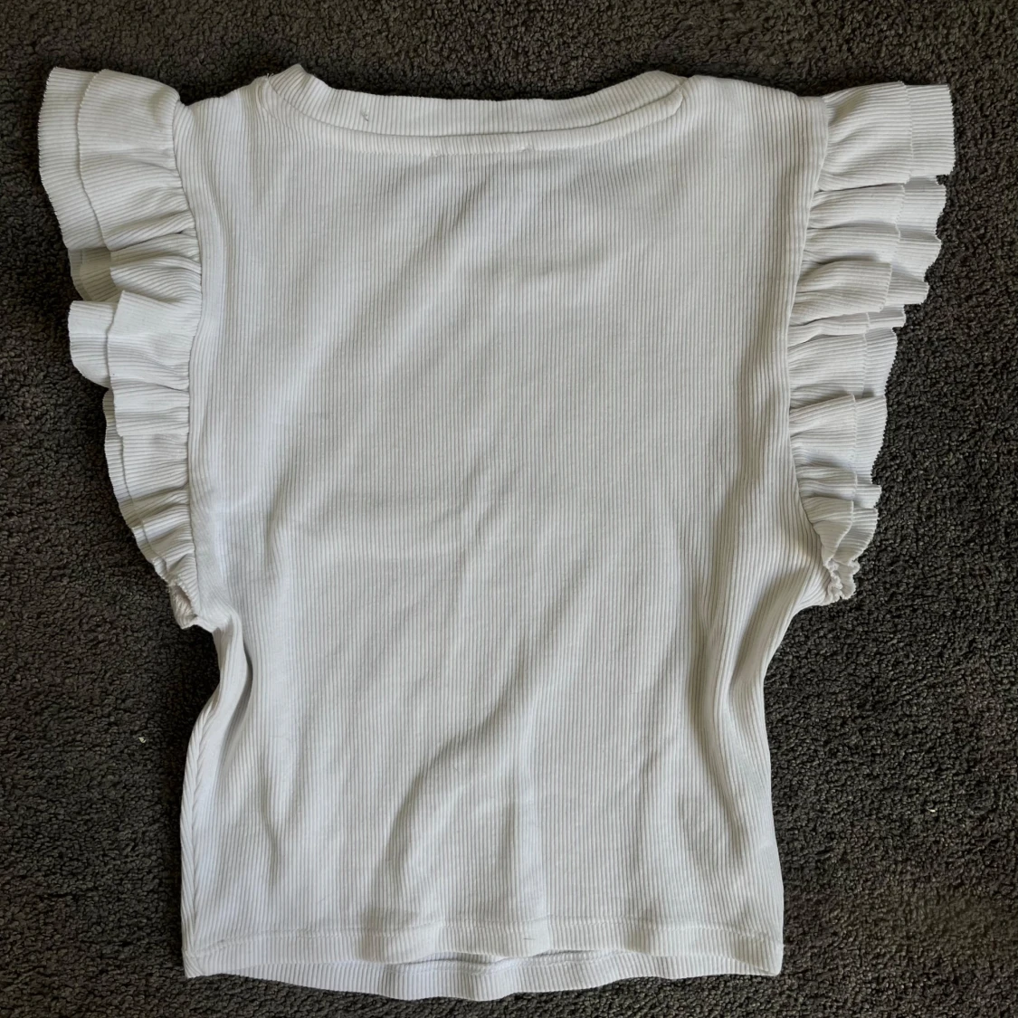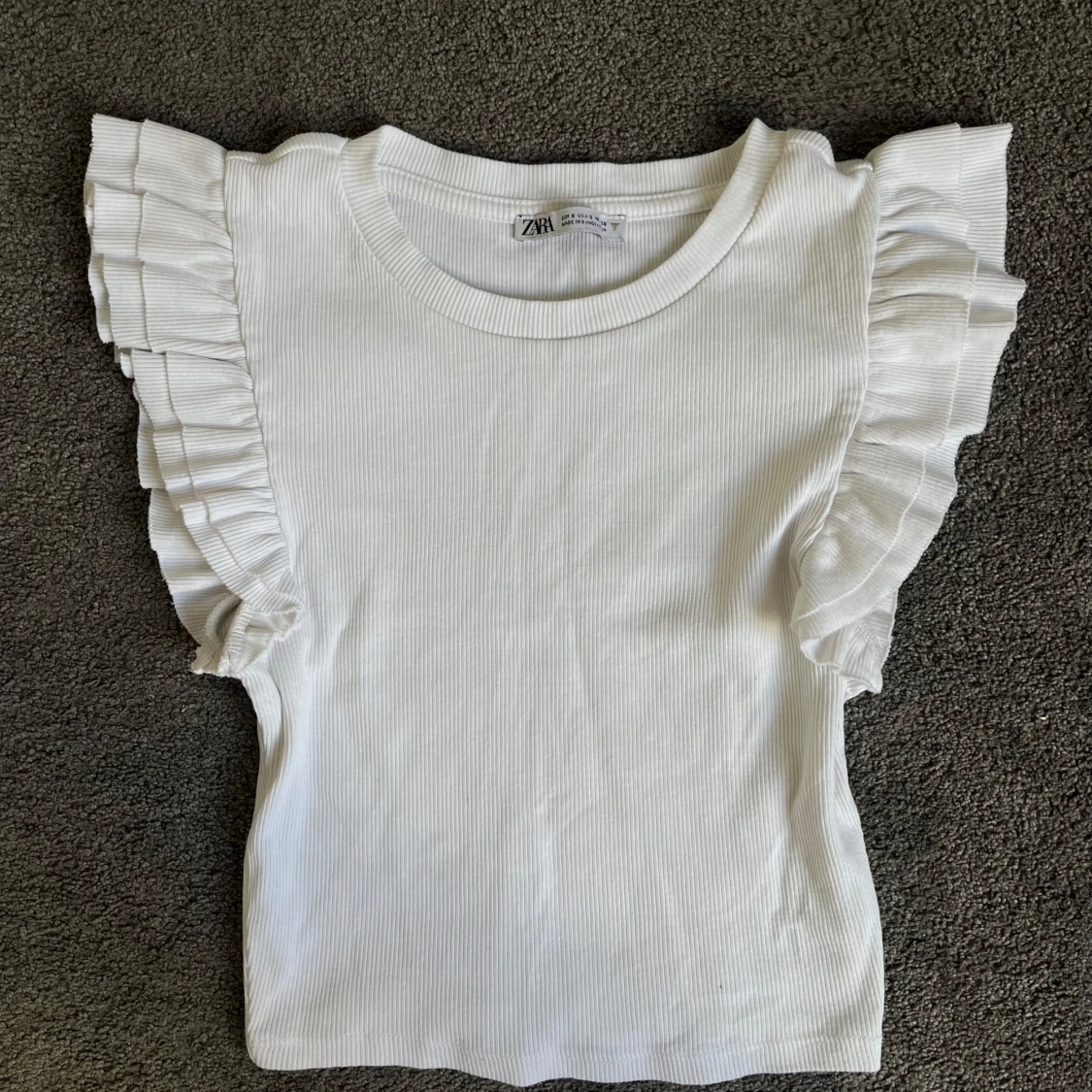 Supersöt vit ribbad topp från Zara med volangdetaljer på axlarna. Perfekt för att piffa upp en enkel outfit. Mjuk och stretchig, passar till många olika stilar.