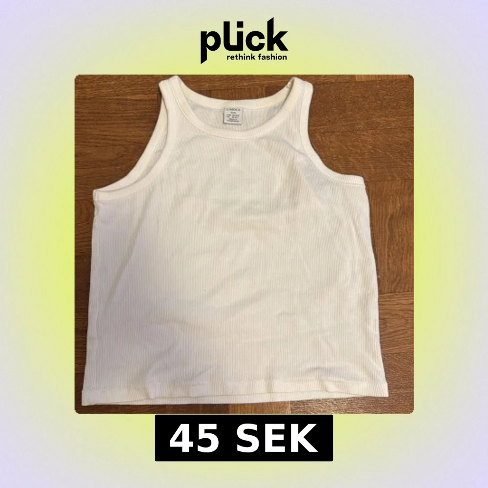 Säljer en vit ribbad linnetopp från Lindex i storlek 146/152. Perfekt för varma dagar eller som ett basplagg i garderoben. Enkel och stilren design.