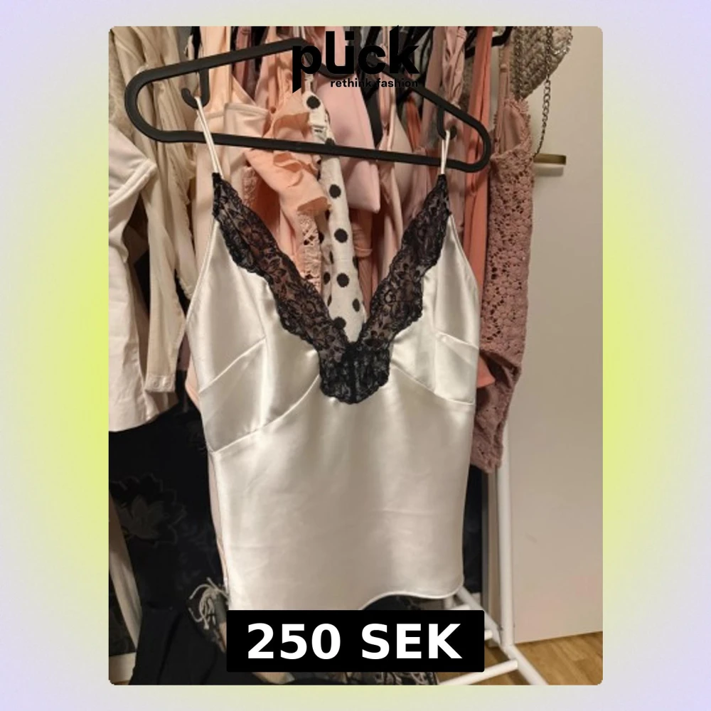 Säljer en snygg vit linnetopp i satin med tunna axelband och djup v-ringning dekorerad med svart spets. Toppen har en glansig finish och sitter lätt och luftigt på kroppen. Perfekt för dig som gillar en chic och feminin stil.