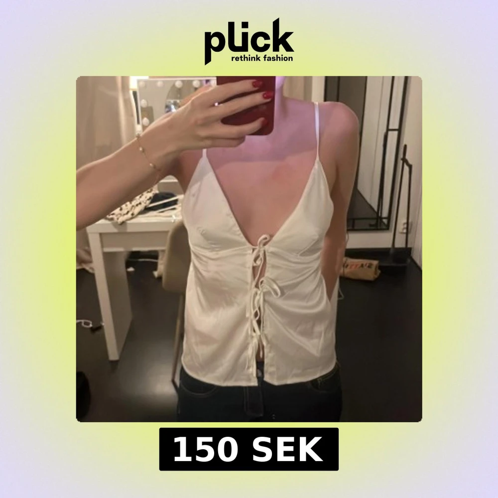 Säljer en vit satintopp med djup v-ringning och smala axelband. Toppen har snygg snörning framtill som ger en trendig look. Perfekt för dig som gillar stilrena och feminina plagg med det lilla extra.