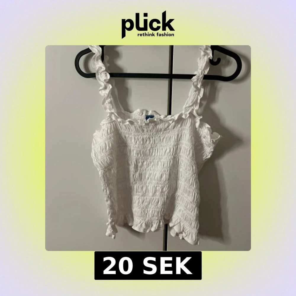 Säljer en vit ribbad linnetopp från Old Navy i storlek M. Toppen har smockad struktur, volangdetaljer vid axelbanden och längs kanten, samt ärmlös design. Perfekt för sommarens alla tillfällen och superfin till både jeans och kjol.