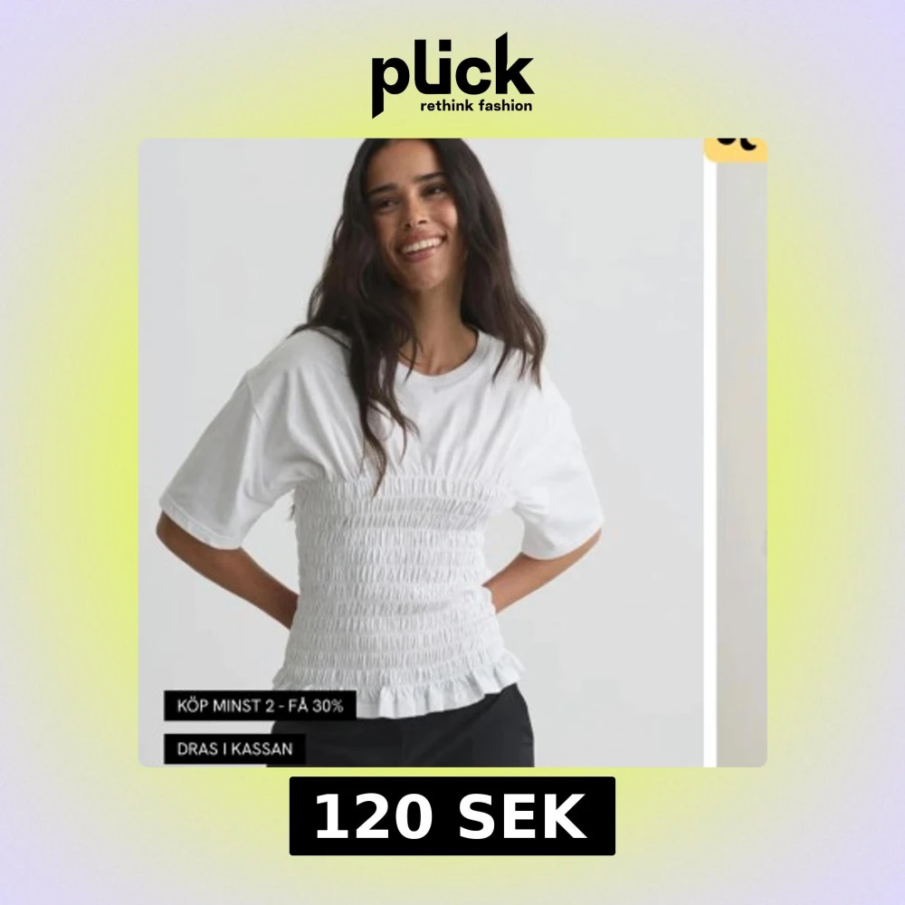 Vit topp med smockad midja och volangkant nertill. T-shirten har korta ärmar och rund halsringning. Perfekt för en fräsch och stilren look.