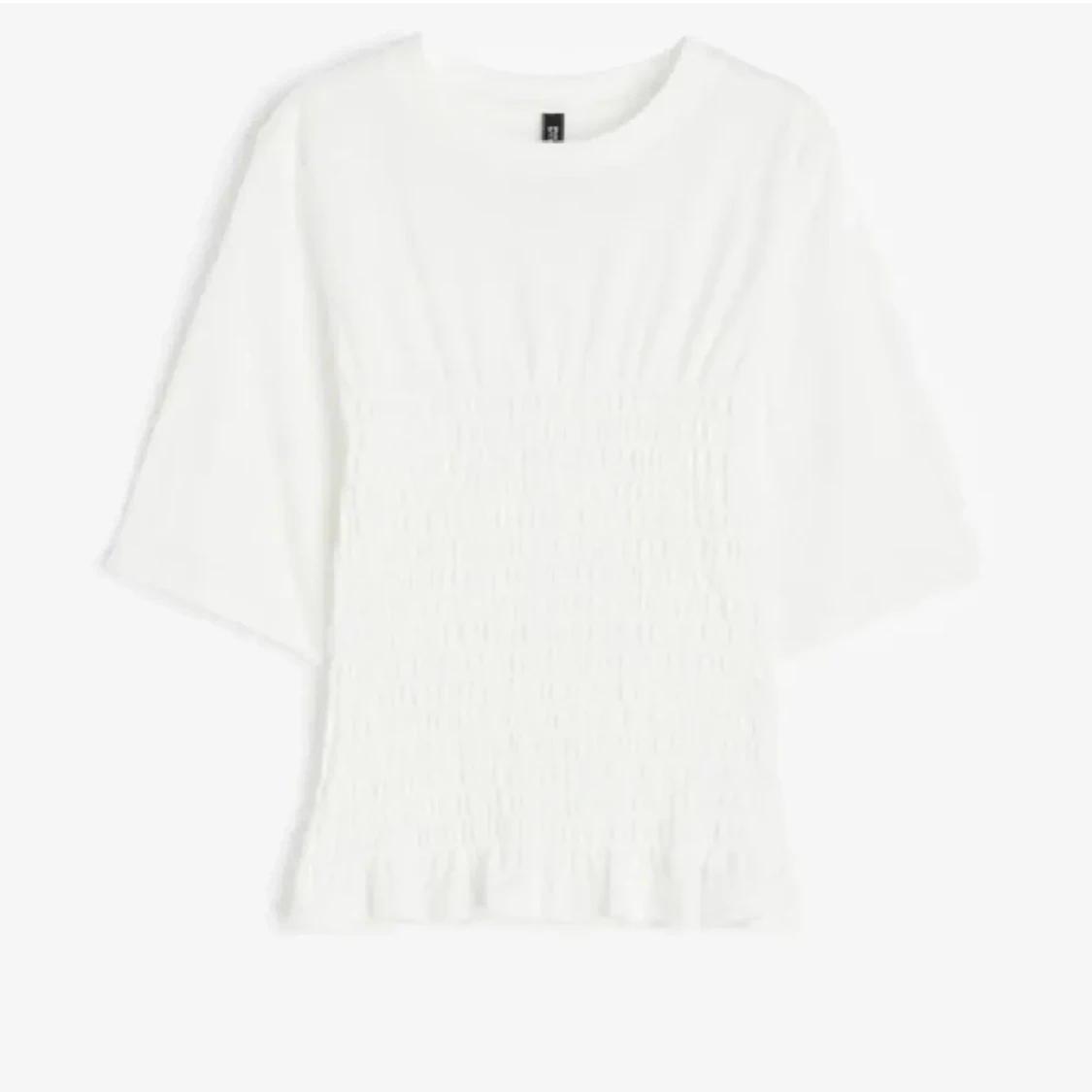 Supersöt vit topp med smockad midja och volangkant nertill. Modellen har korta ärmar och rund halsringning. Perfekt för dig som gillar en feminin och trendig look. Toppens material känns mjukt och lätt mot huden.