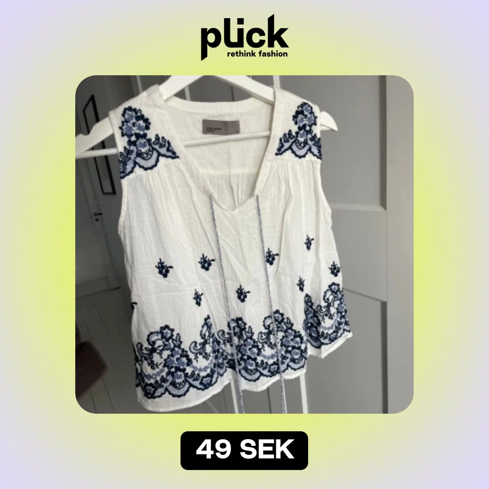 Vitt linne med blåa mönsterdetaljer, samt snören att knyta framtill. Storlek XS. OBS skrynklig på bilden.