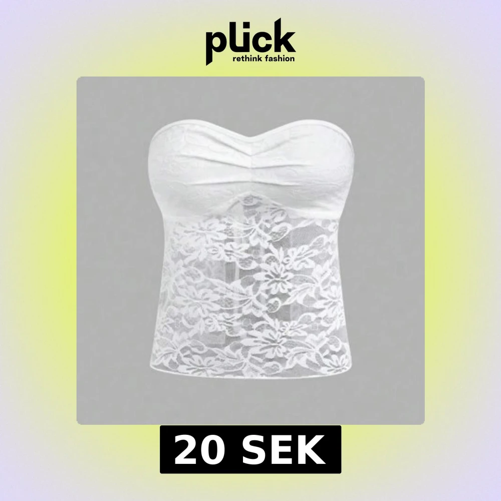 Supersöt vit bandeau tubtopp i spets med blommigt mönster. Toppen är axelbandslös och har en snygg knytning i ryggen. Tunn och luftig, passar perfekt till varma dagar. Storlek M men passar som Lite