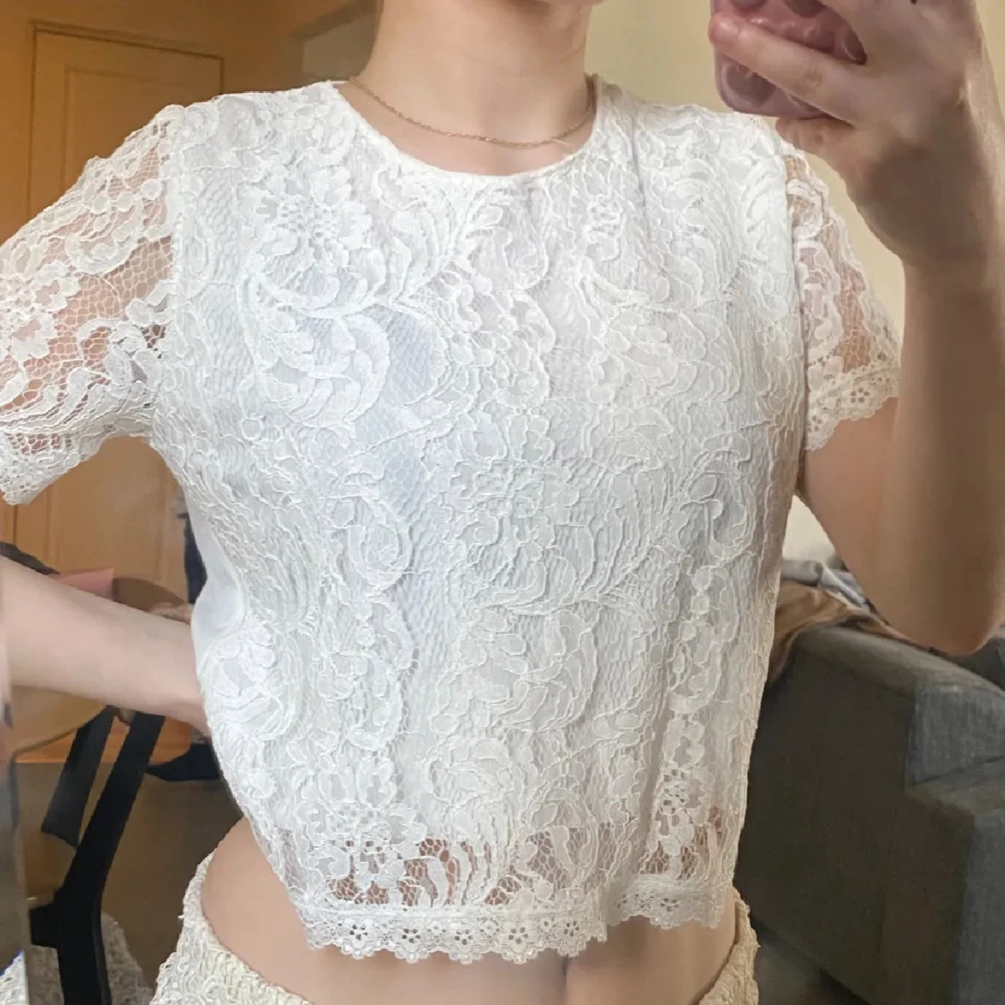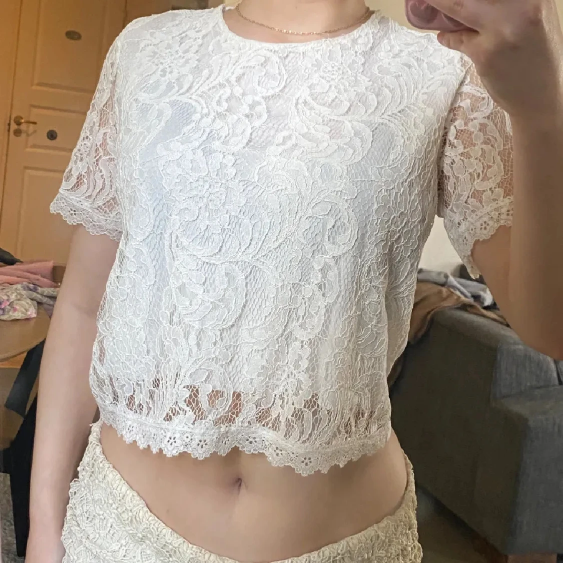 Säljer en söt vit spetsblus med korta ärmar och ett vackert blommönster. Blusen är croppad och har en fin kantdetalj längst ner. Perfekt för en somrig look!