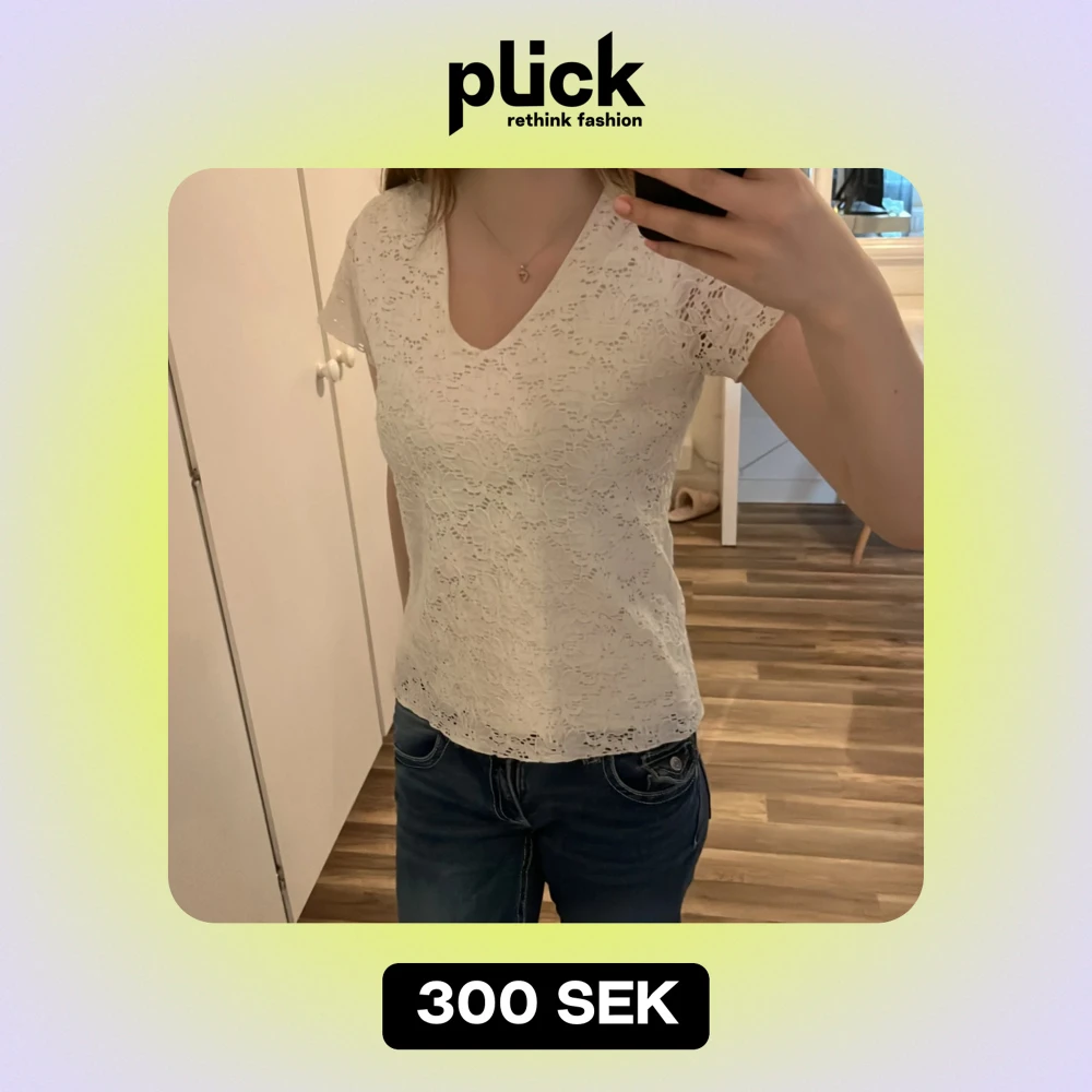 Säljer en söt vit spetsblus med korta ärmar och v-ringning.