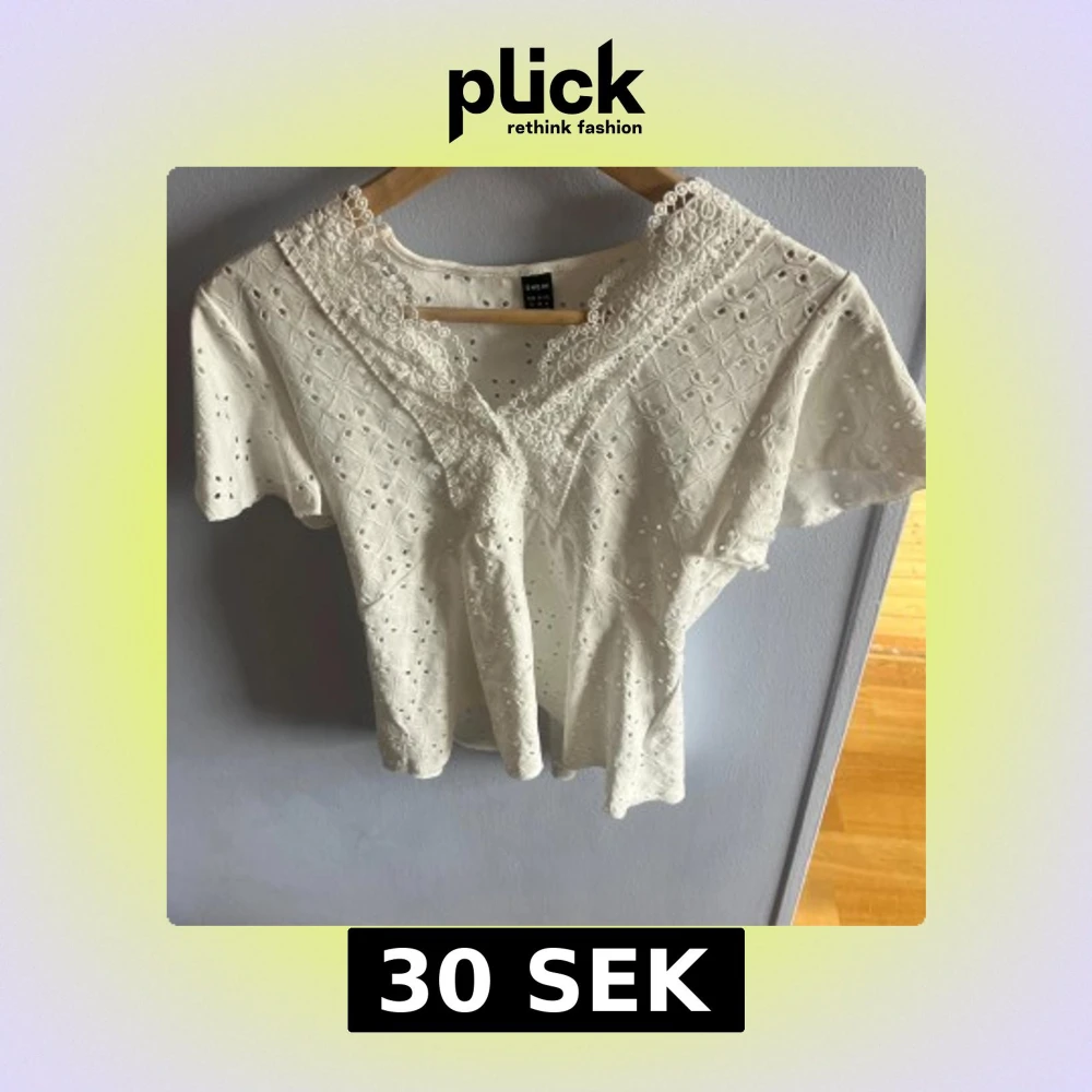 Supersöt vit blus från SHEIN i storlek M med broderade detaljer och spets runt v-ringningen. Blusen har korta ärmar och ett genombrutet mönster. Säljer då jag inte tyckte den satt så bra på just mig!! Storlek m men passar mig som S/xs