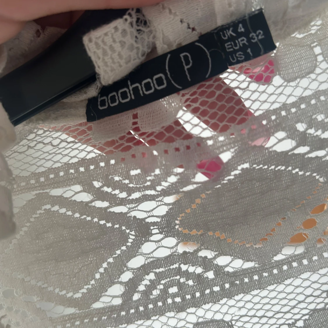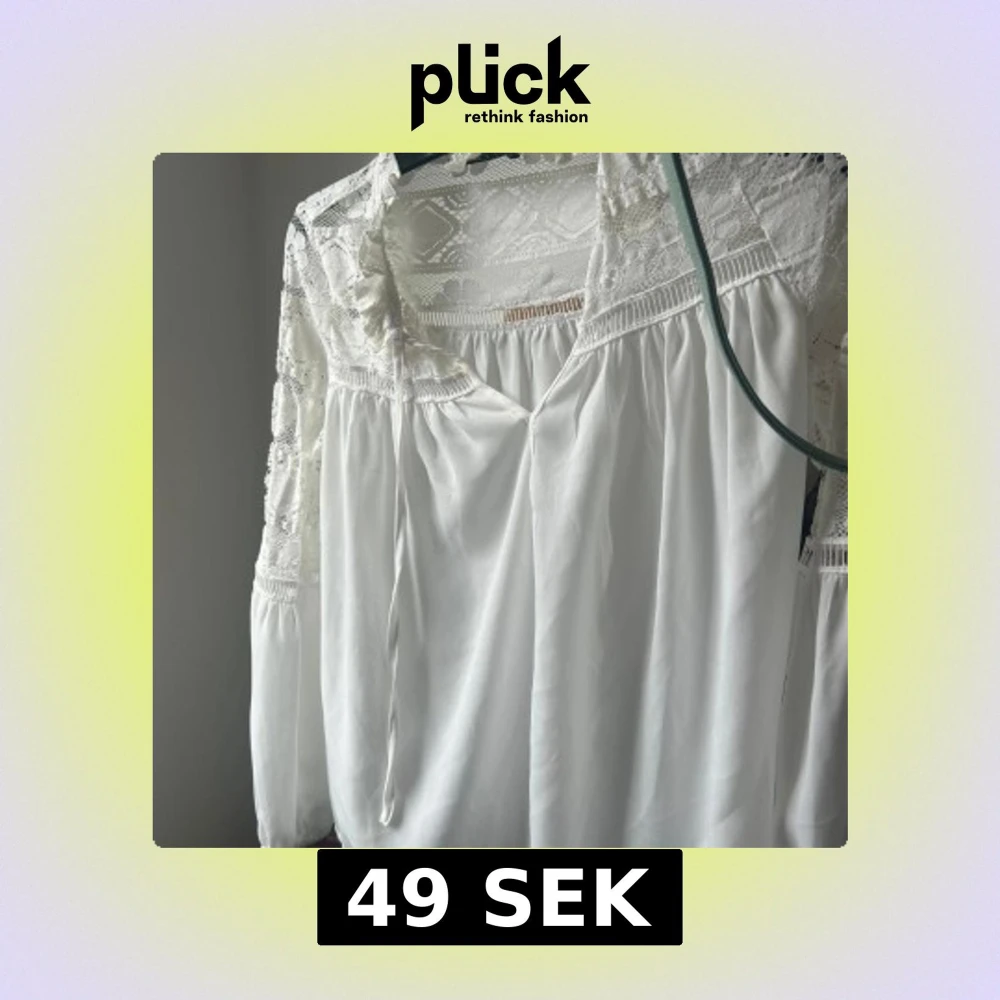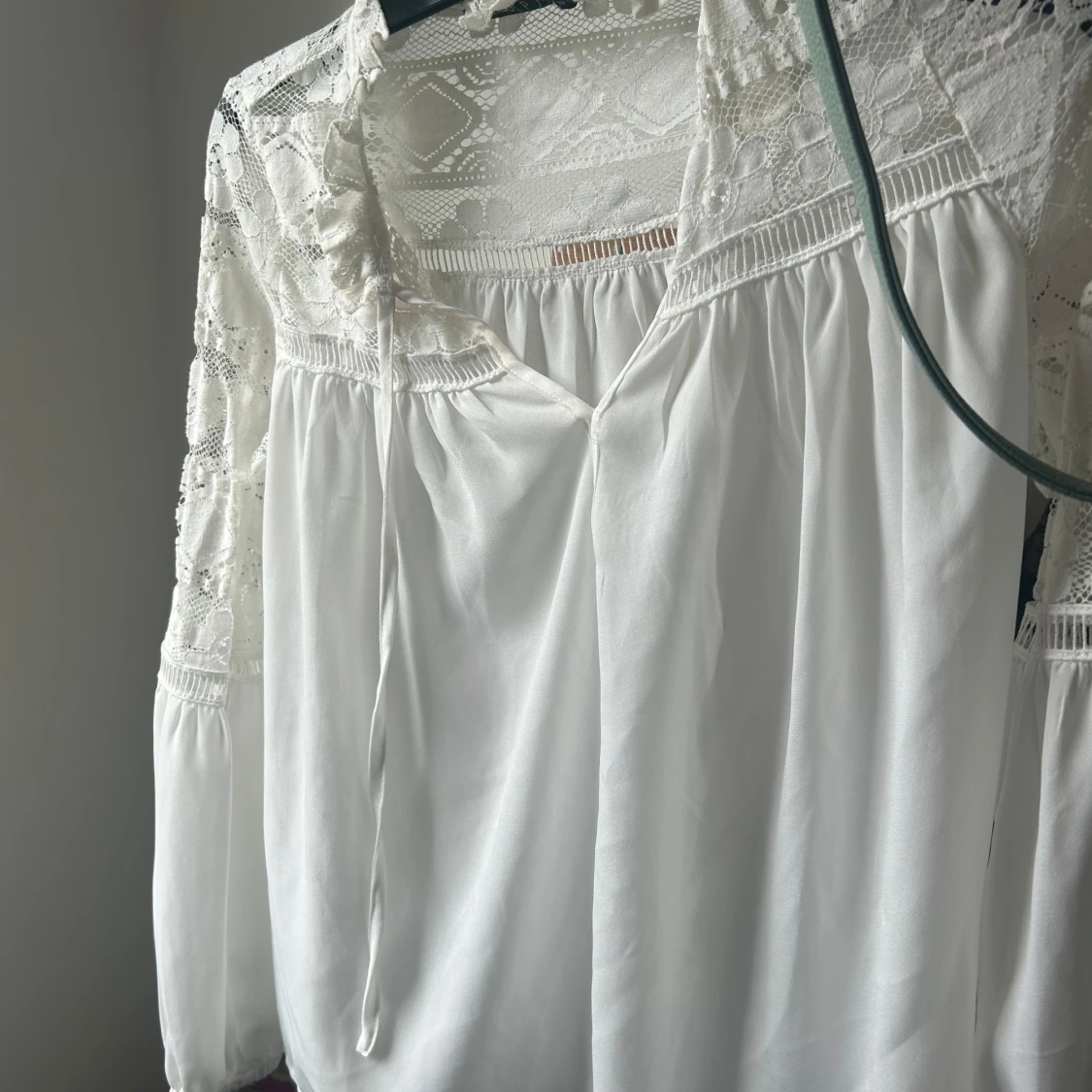 Supersöt vit blus från Boohoo med spetsdetaljer upptill och på ärmarna. Blusen har v-ringning med knytband och långa ärmar. Perfekt för dig som gillar romantisk och bohemisk stil.