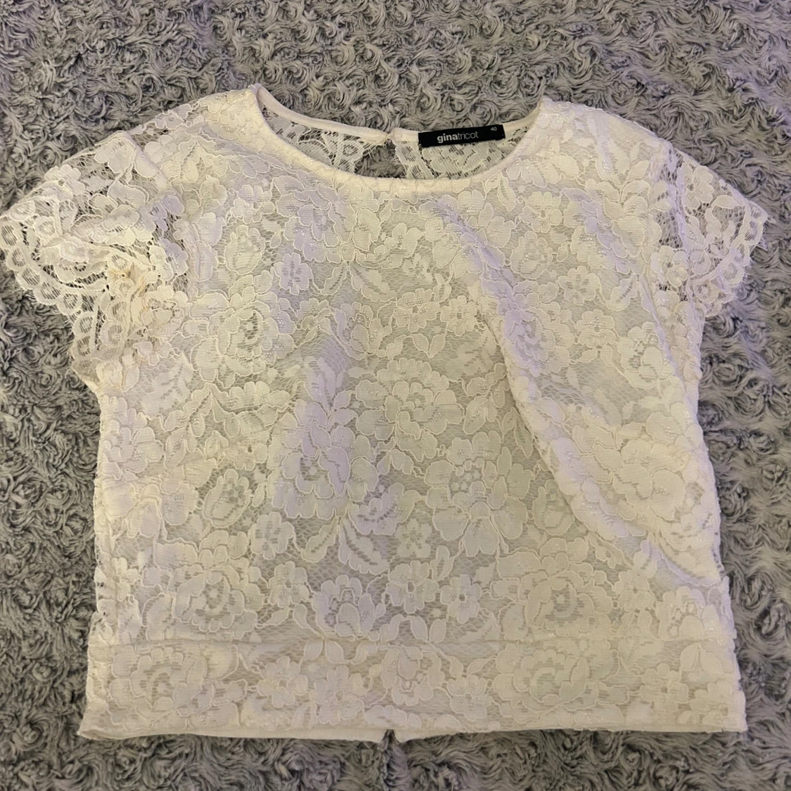 Säljer en vit blus från Gina Tricot med blommigt spetsmönster och korta ärmar. Blusen har rund halsringning, knappar i ryggen och är fodrad framtill. Perfekt för dig som gillar romantisk och feminin stil.