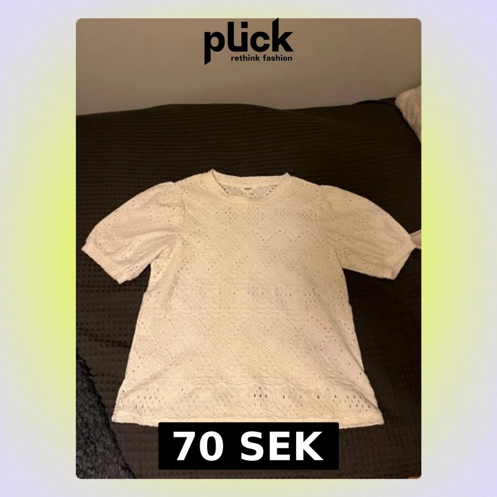 Säljer en söt vit blus från Object i storlek S. Blusen har korta puffärmar och är täckt av ett broderat spetsmönster med små hål för en luftig känsla. Perfekt till jeans eller kjol för en fräsch look.