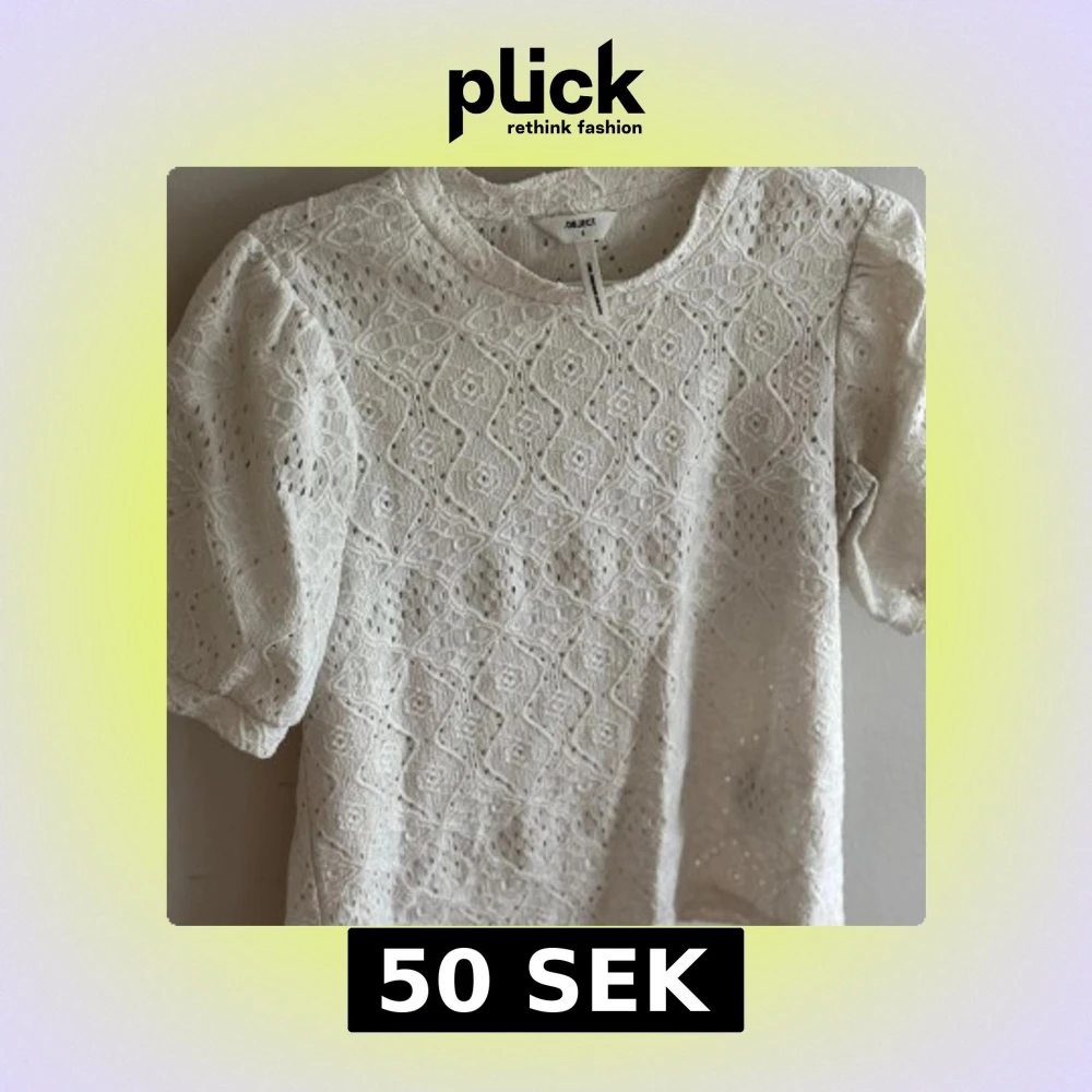 Superfin vit blus från Object med korta puffärmar och vackert spetsmönster över hela toppen. Blusen har rund halsringning och är tillverkad i ett luftigt material som känns både romantiskt och trendigt.