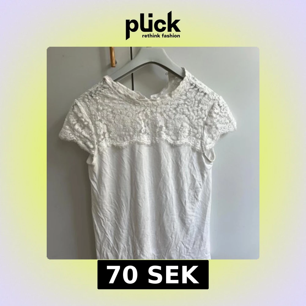 Supersöt vit blus från R Édition med korta ärmar och detaljerad spets upptill. Blusen har rund halsringning, knapp i nacken och blommigt spetsmönster över axlar och bröst.