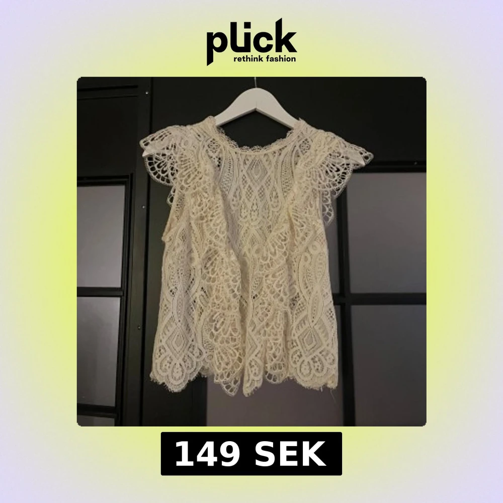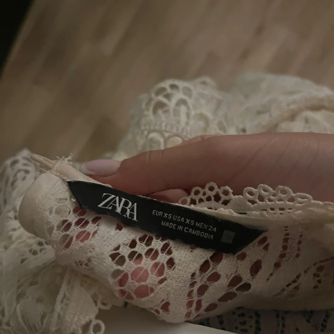 Superfin vit blus från Zara i storlek XS, med detaljerad spets och volang vid axlarna. Blusen är ärmlös och har ett romantiskt mönster med snygga broderier. Perfekt för dig som gillar en söt och trendig look.