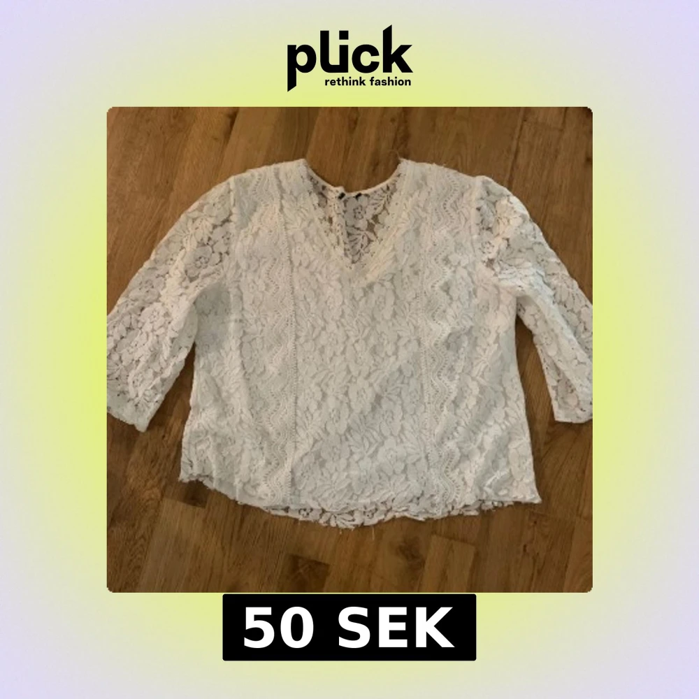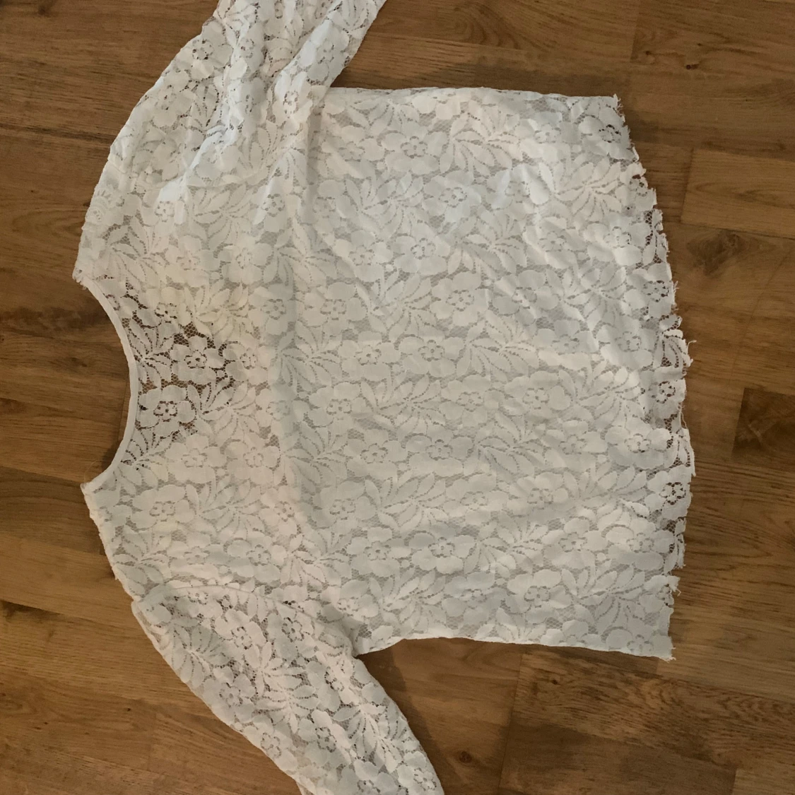 Superfin vit blus i spets med blommigt mönster och v-ringning. Blusen har trekvartsärm och är helt genombruten i spets. Perfekt att styla med jeans eller kjol för en söt look. Har klippt längst ner för att den var lite lång förut. Etiketten är borta men ser ut som en storlek S.