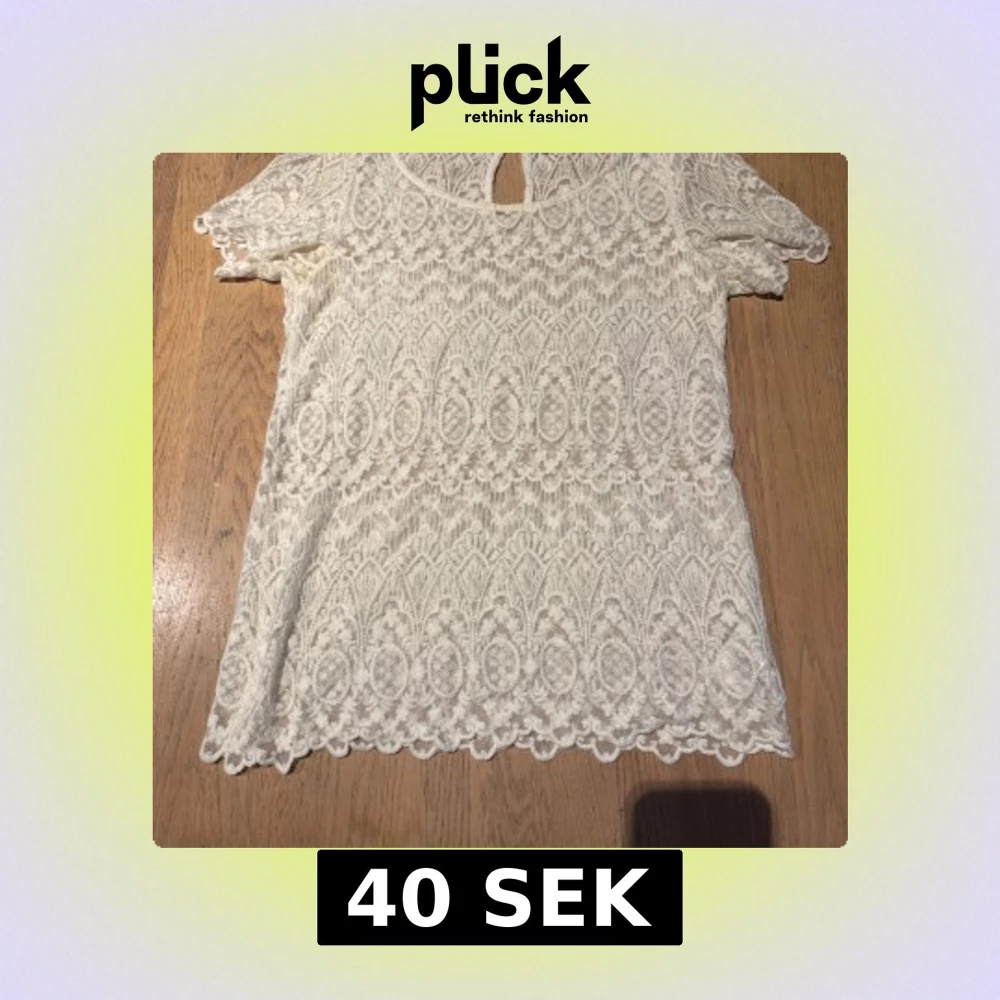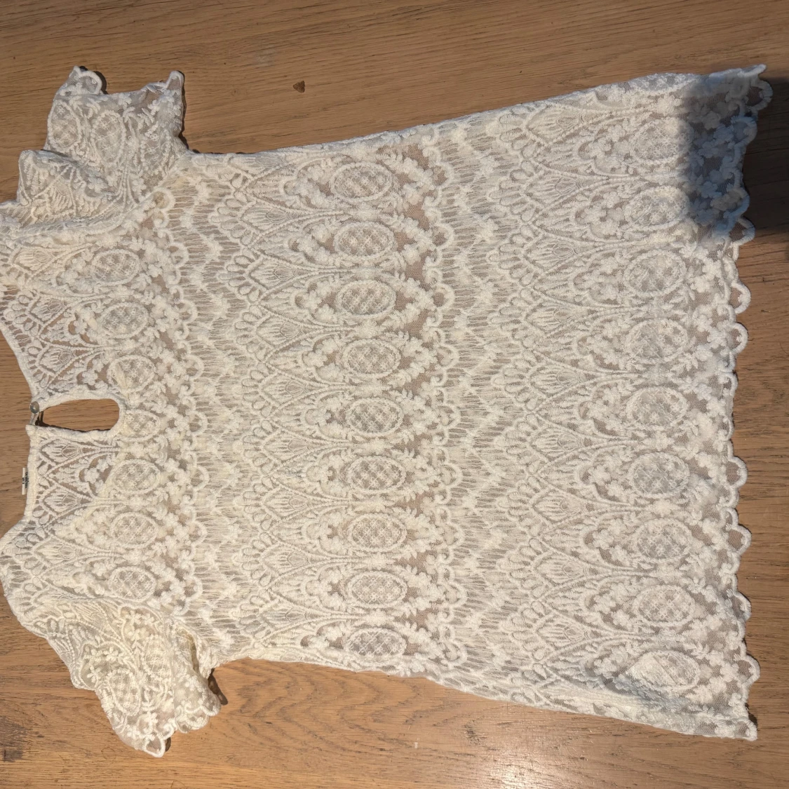 Superfin vit blus i spets med korta ärmar och vackert broderat mönster. Blusen har rund halsringning och en liten knapp i nacken.