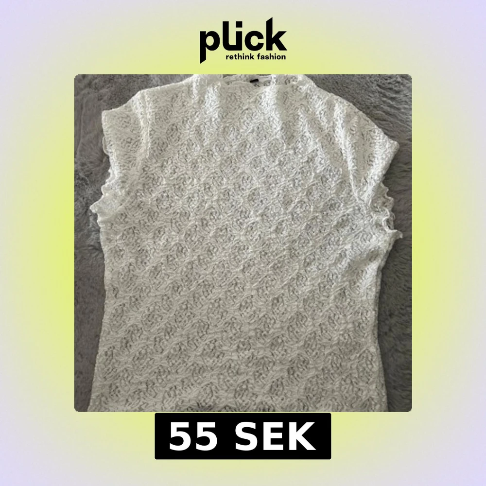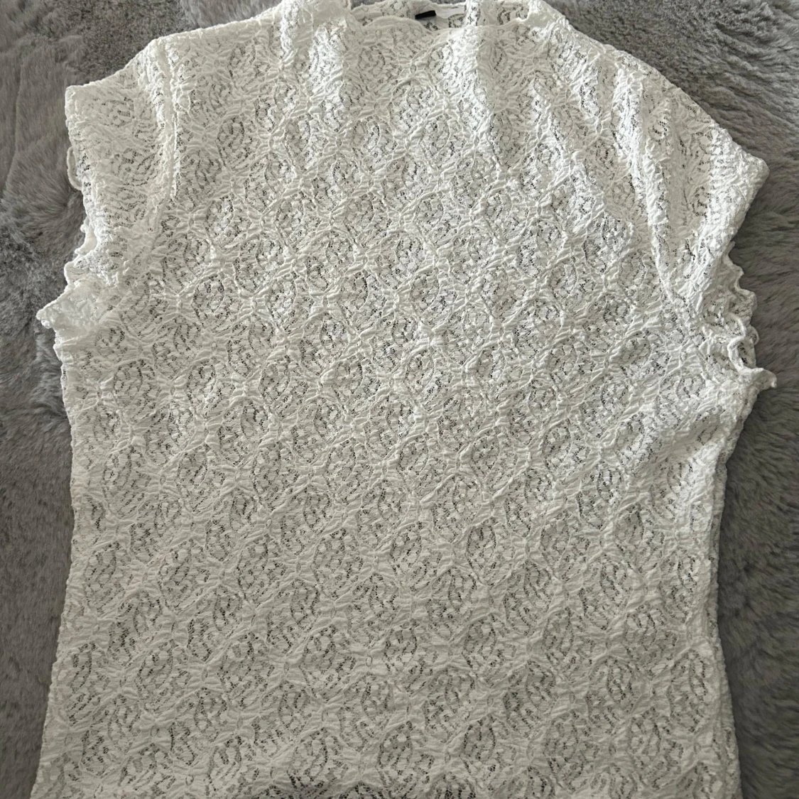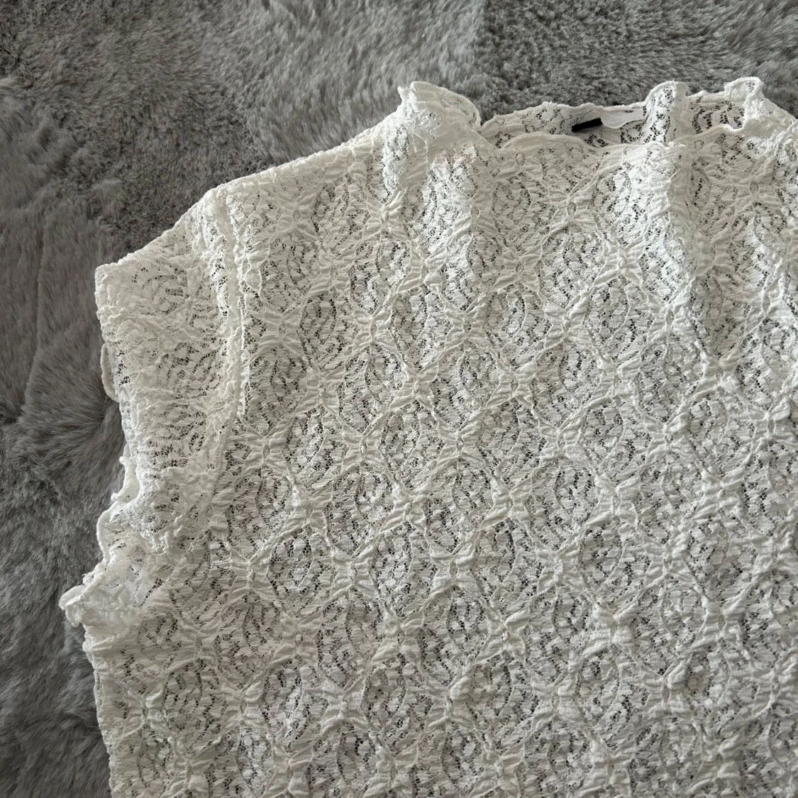 Säljer en vit blus i spets med vackert mönster och korta ärmar. Toppen har en hög hals och är tillverkad i ett tunt, genombrutet material som ger en romantisk känsla. Perfekt att styla med jeans eller kjol för en trendig look.