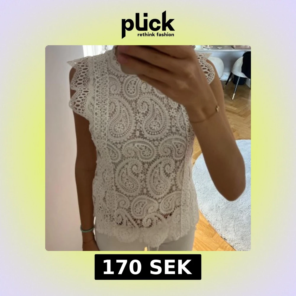 Superfin vit blus i spets med detaljerat paisleymönster och små blommor. Blusen är ärmlös med volangkant vid axlarna.
