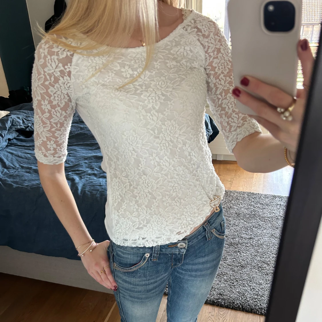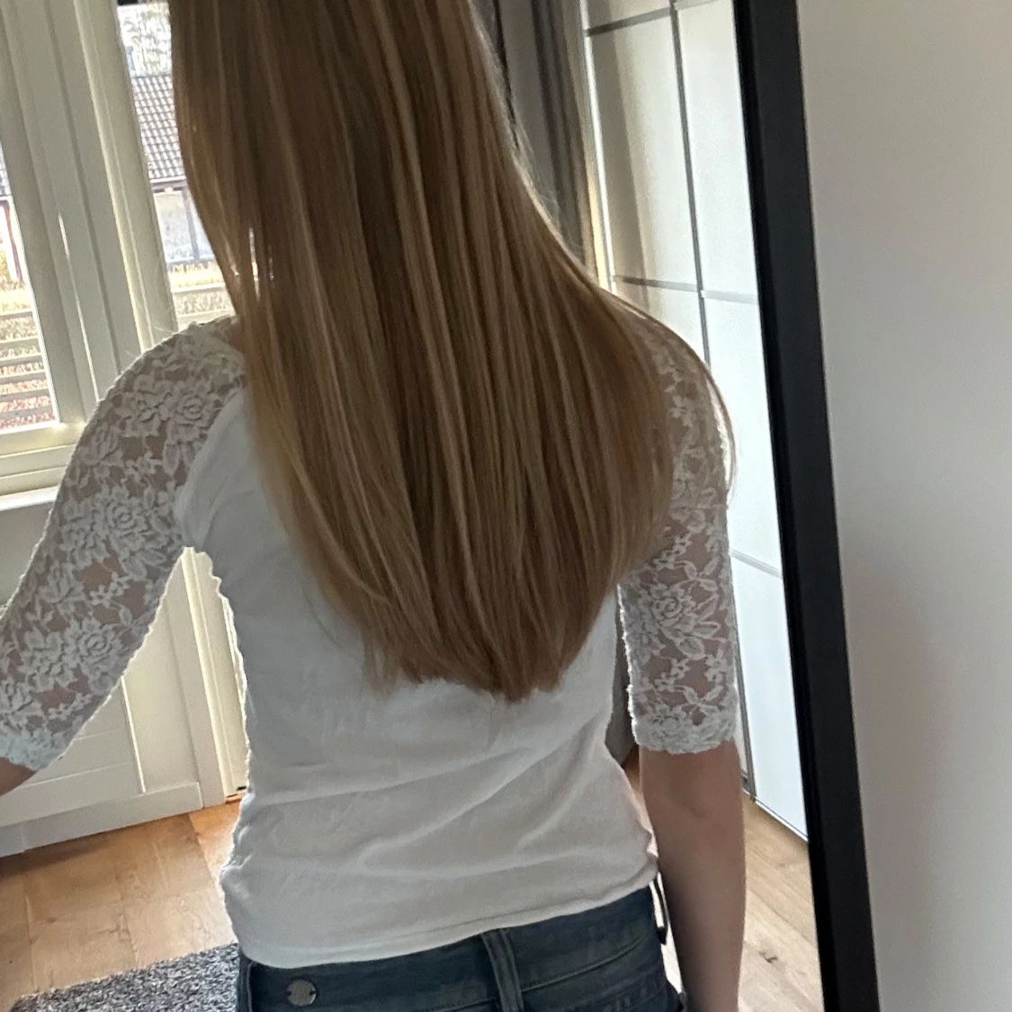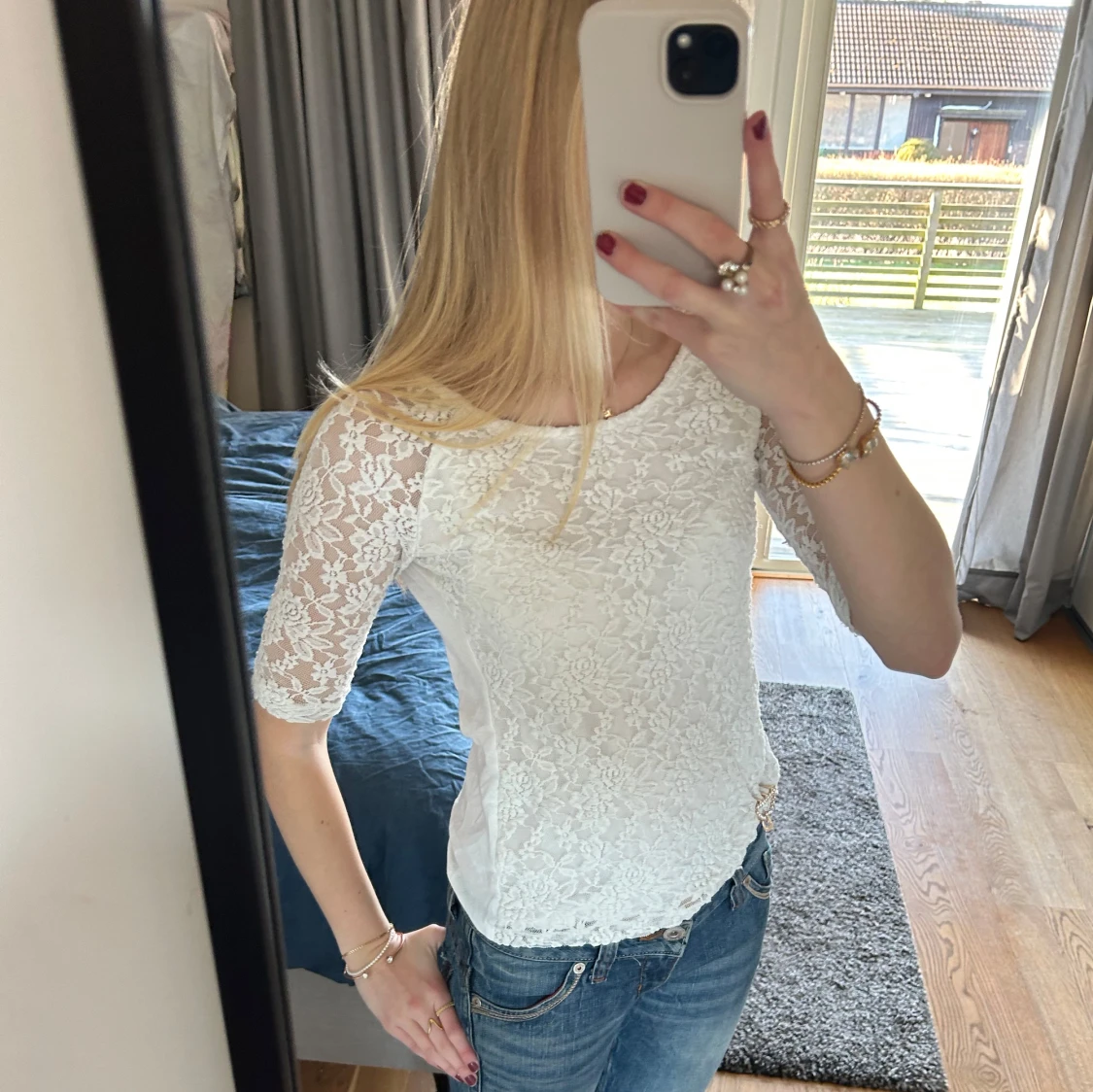 Säljer en elegant vit spetsblus med trekvartsärm. Blusen har ett vackert blommigt mönster och en figurnära passform💗💗
