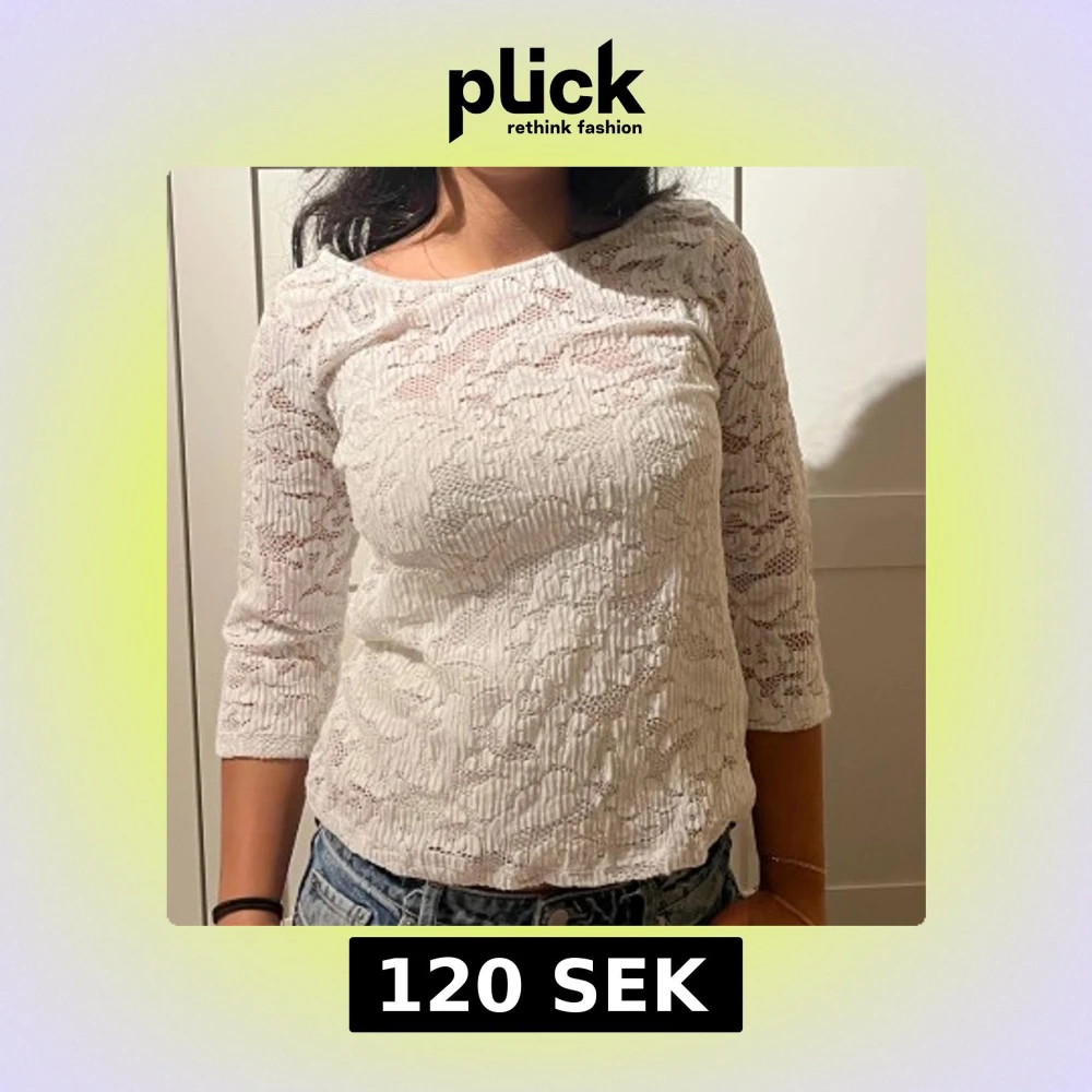 Säljer en söt vit blus i spets med trekvartsärmar och rund halsringning. Blusen har ett diskret mönster och är lätt transparent, perfekt att matcha med jeans eller kjol. Den har en feminin och fräsch look som passar till många stilar.