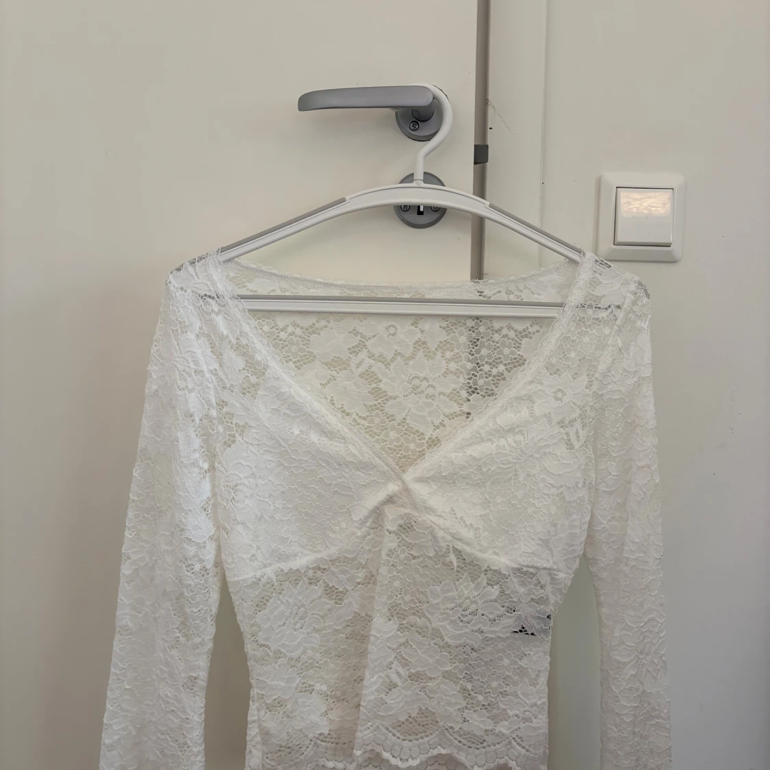 Säljer en vit långärmad blus i spets med v-ringning och fina spetsdetaljer. Oanvänd men ingen prislapp kvar