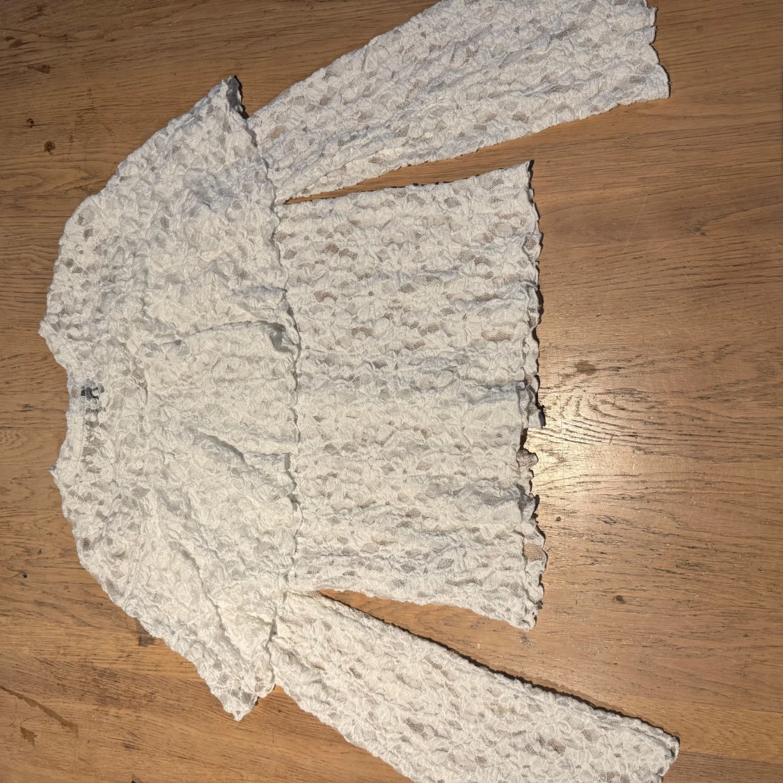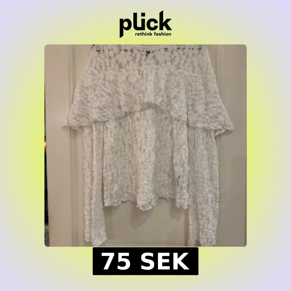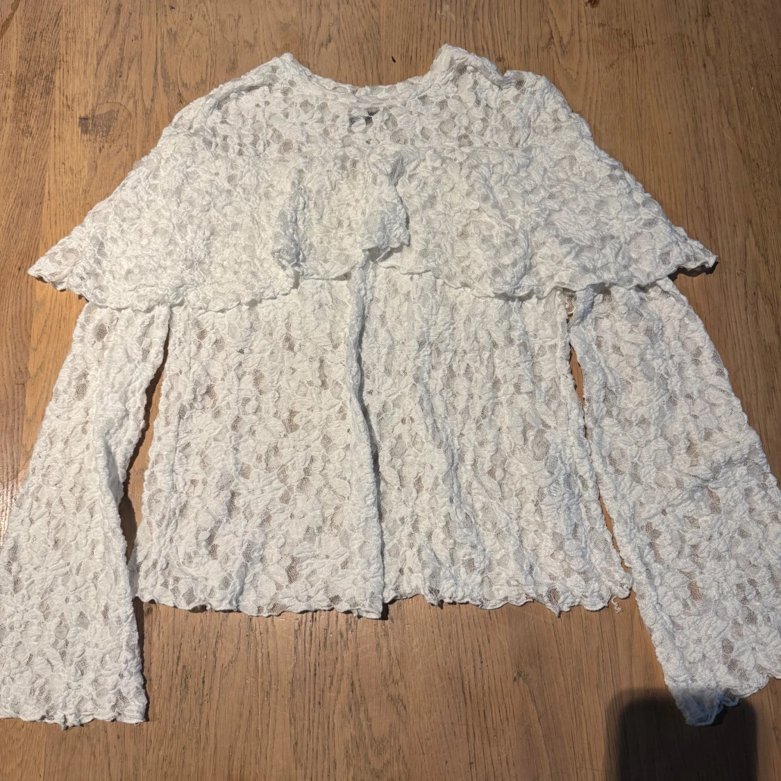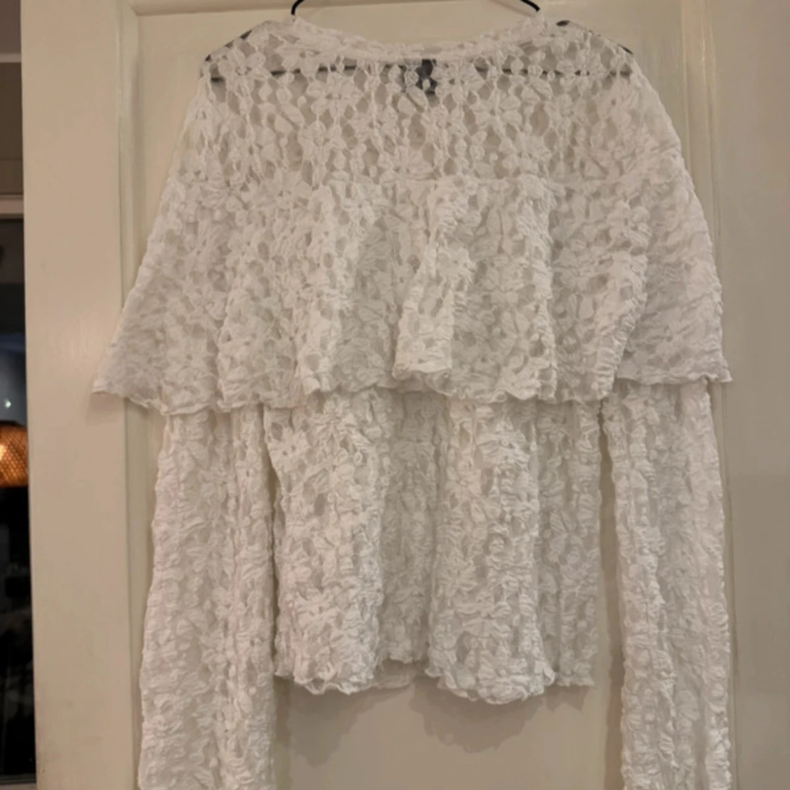 Superfin vit blus i spets med lång ärm och bred volang över axlarna. Blusen är ganska genomskinlig och har en romantisk känsla med sitt blommiga spetsmönster. 🥰