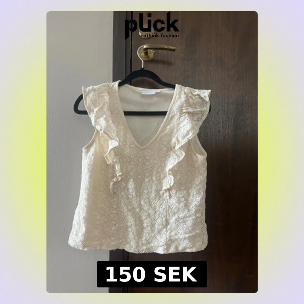 Söt vit blus i spets med v-ringning och volangdetaljer längs axlarna. Ärmlös modell som ger en luftig känsla och passar perfekt till sommaren. Blusen har ett romantiskt mönster och är fodrad undertill för extra komfort. Det har gått en tråd men går lätt att sy ihop. Säljer för att den är för liten. Från Vila. Storlek 34.