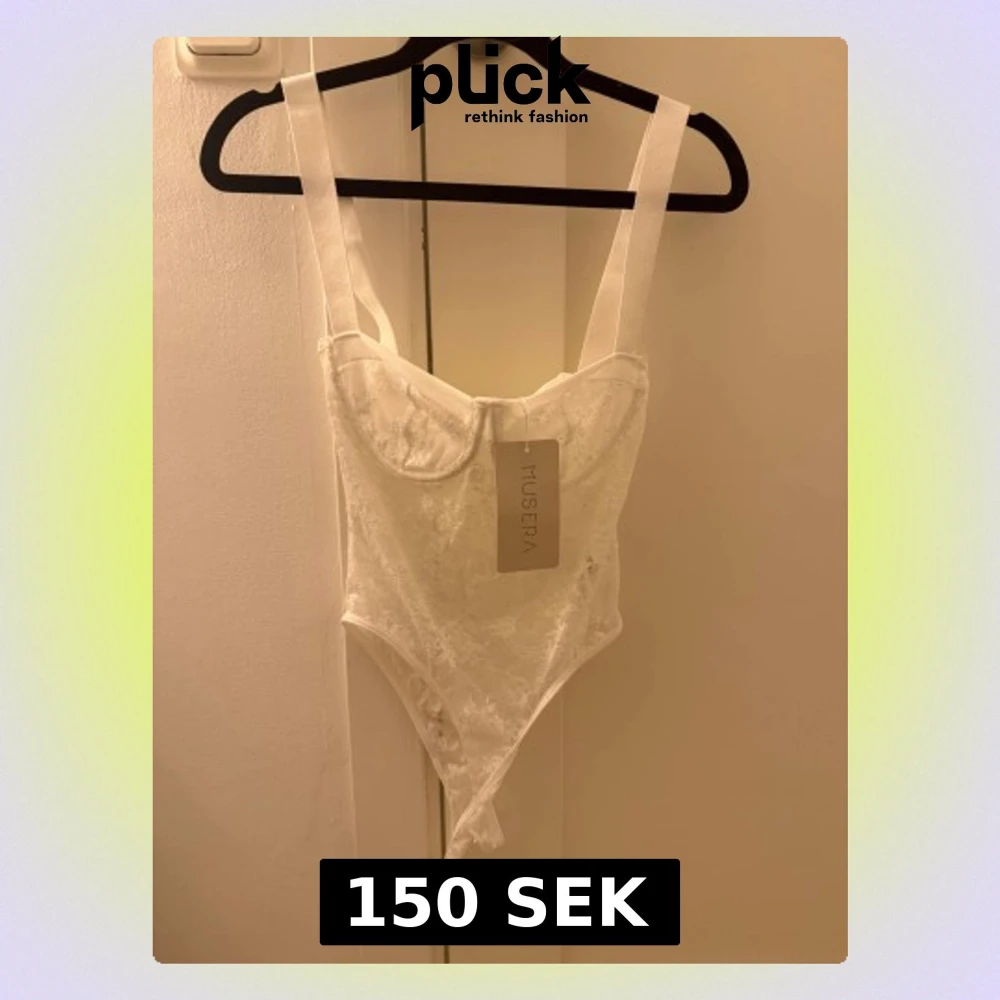 Säljer en vit body med breda axelband och vacker spets över hela plagget. Modellen har markerade kupor och en feminin siluett. Perfekt för dig som vill ha en chic och trendig topp med lite edge.