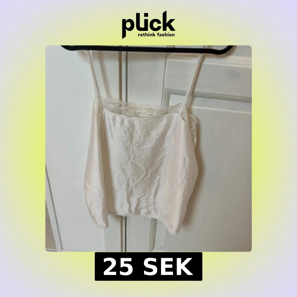 Säljer en vit linnetopp med tunna axelband och fina spetsdetaljer längs överkanten. Toppen är tillverkad i glansig polyamid-nylon som ger en lyxig känsla. Perfekt att styla med jeans eller kjol för en trendig look.