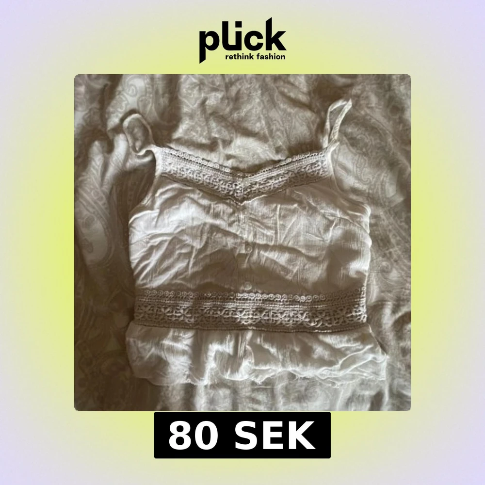Supersöt vit linnetopp från Lindex med tunna axelband, knappar framtill och fina virkade spetsdetaljer vid halsringning och midja. Toppen har en lätt volang nertill och är perfekt för varma dagar.