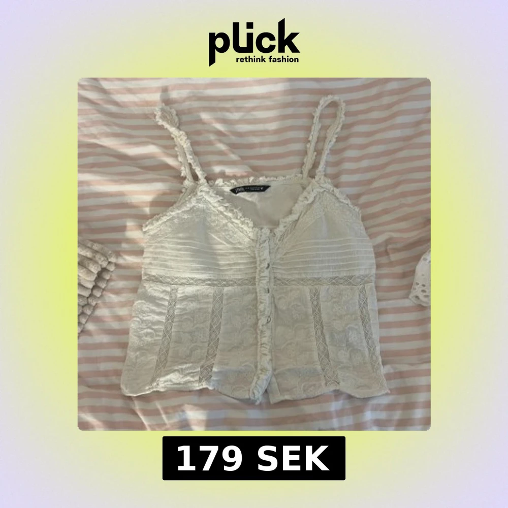 Superfin vit linnetopp från Zara med tunna axelband och volangkant. Toppen har broderade spetsdetaljer, dekorativa sömmar och knappar framtill. Perfekt för en somrig look med romantiska vibbar och vintagekänsla. Storlek M men passar mer som S
