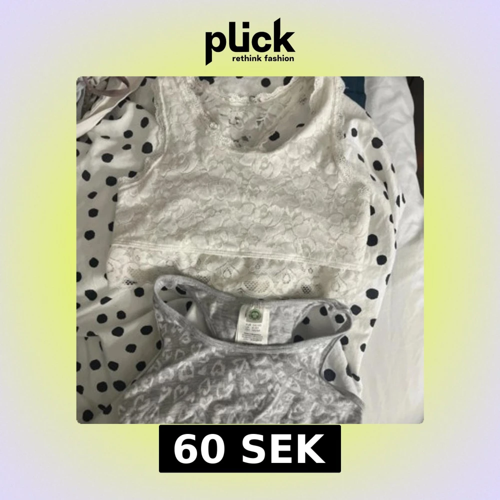 Två toppar från Lindex: en vit linnetopp i spets med blommigt mönster och racerback, samt en grå linnetopp med vita hjärtan och sportig rygg. Båda är ärmlösa och har en croppad passform, perfekta för att ge en chill vibe till din outfit.