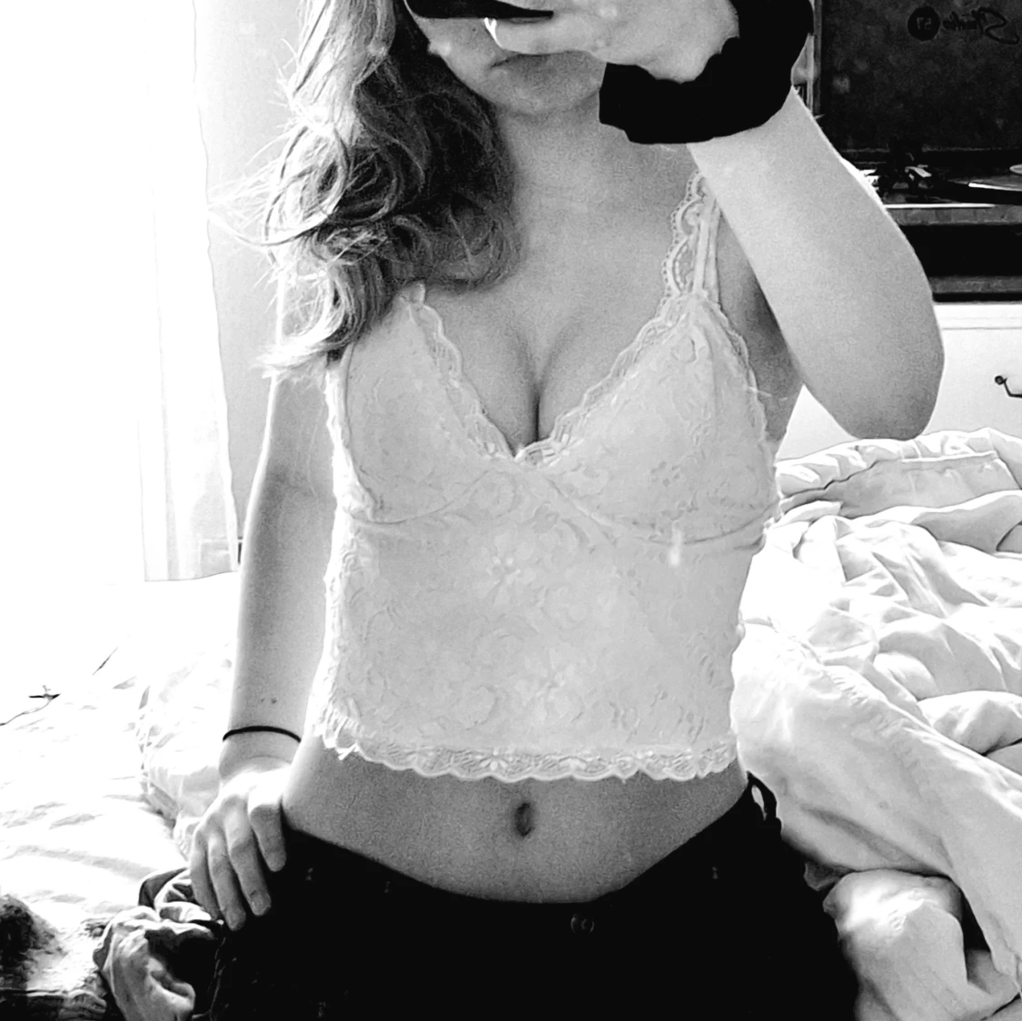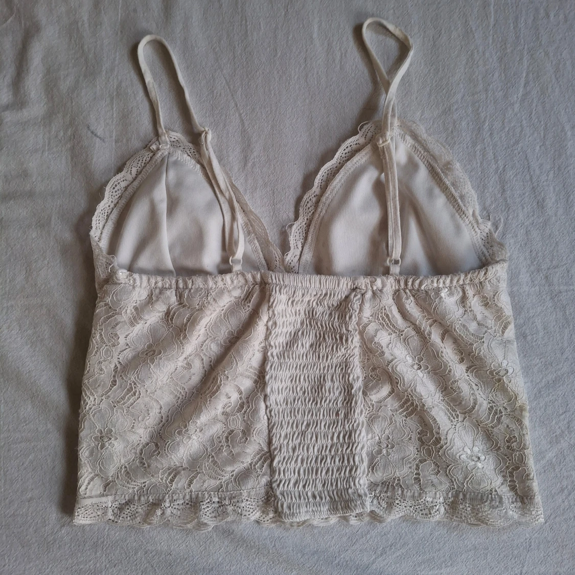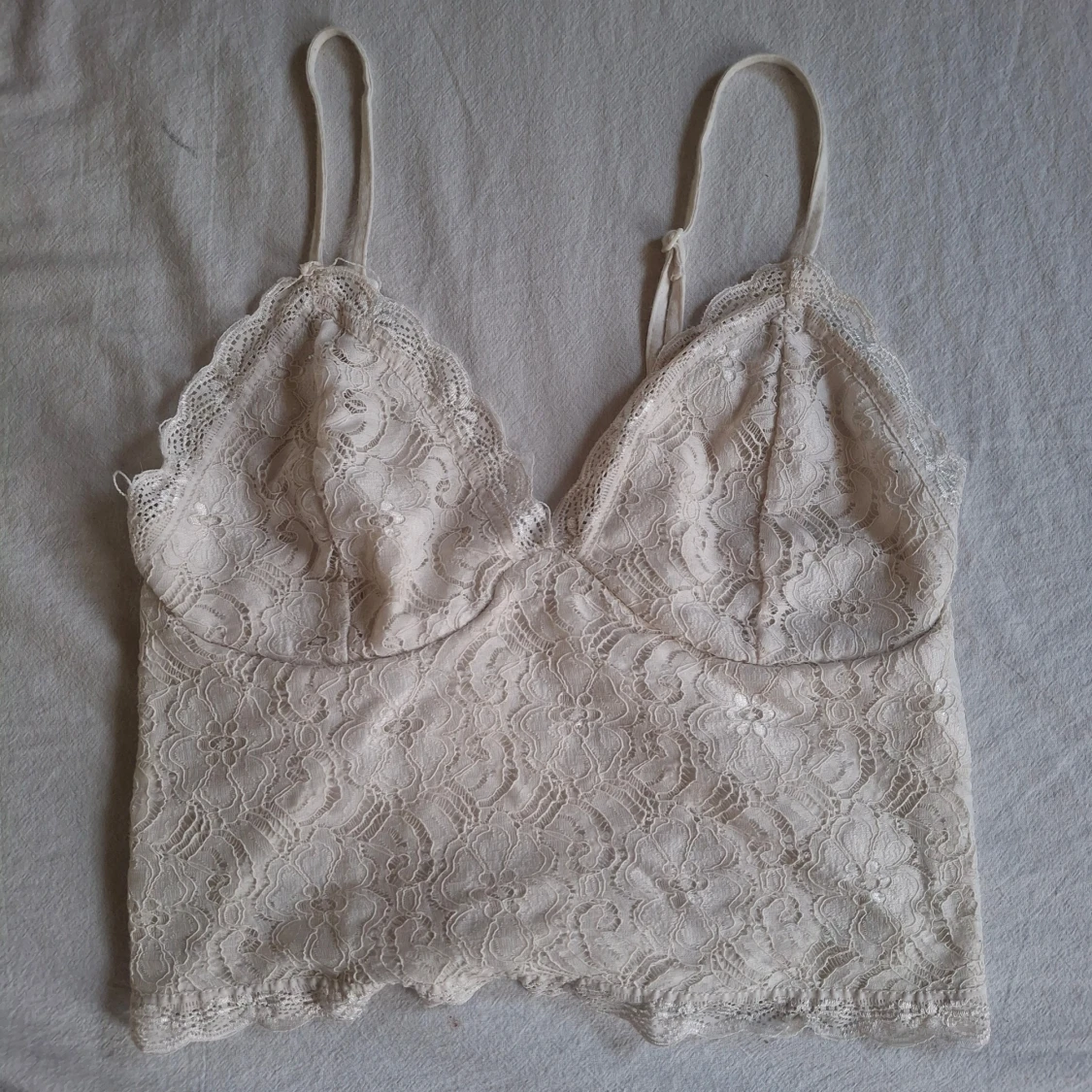 Säljer mitt fina, vita spetslinne med justerbara axelband och blommigt mönster. Toppen har en elegant design med spetsdetaljer och en elastisk rygg för bättre passform.