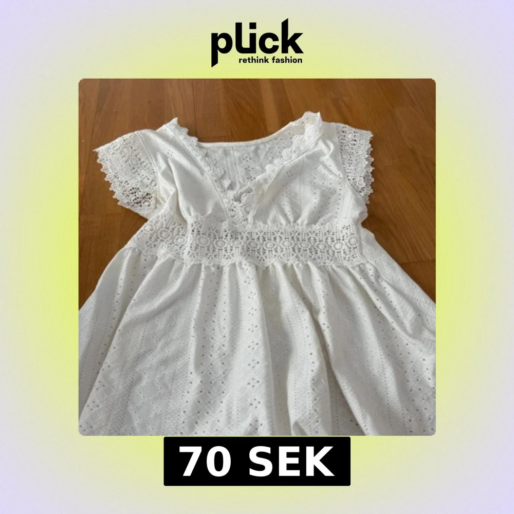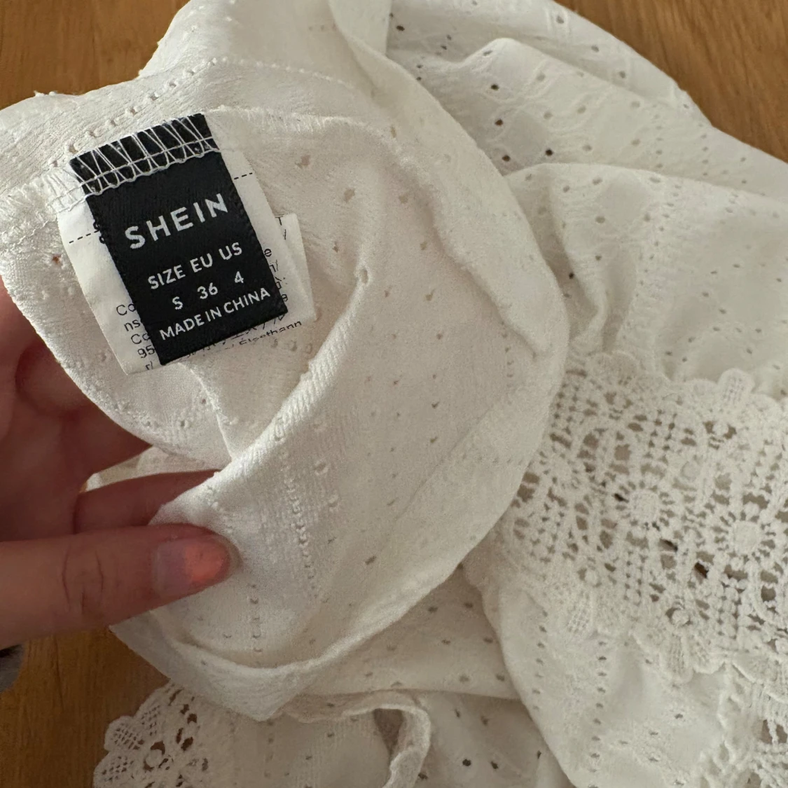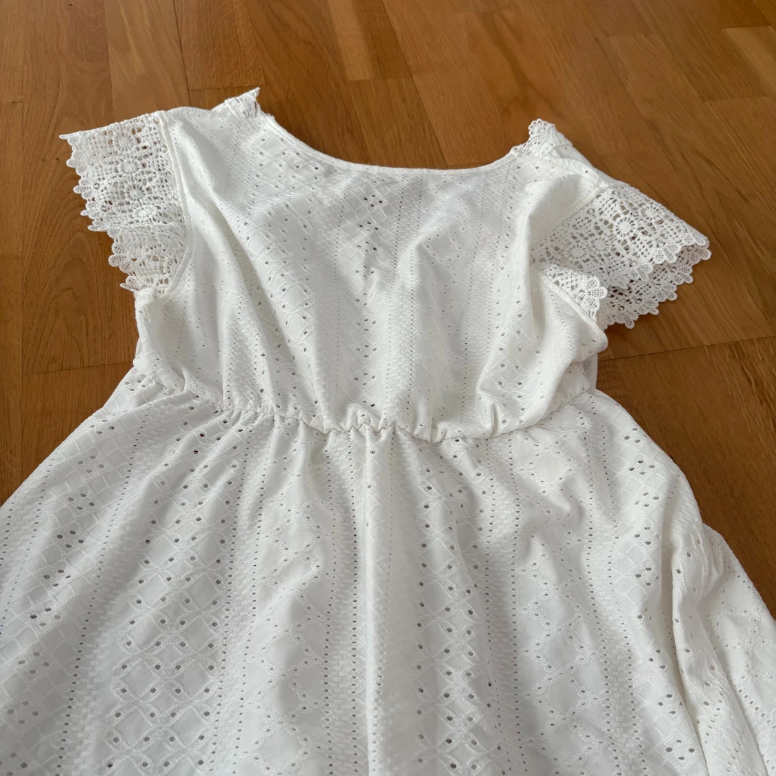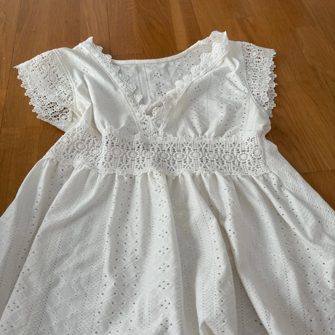 Superfin vit kortklänning från SHEIN i storlek S. Klänningen har v-ringning, spetsdetaljer vid midjan och ärmarna samt broderat mönster över hela tyget. Perfekt för sommarens alla tillfällen och ger en romantisk vibe.