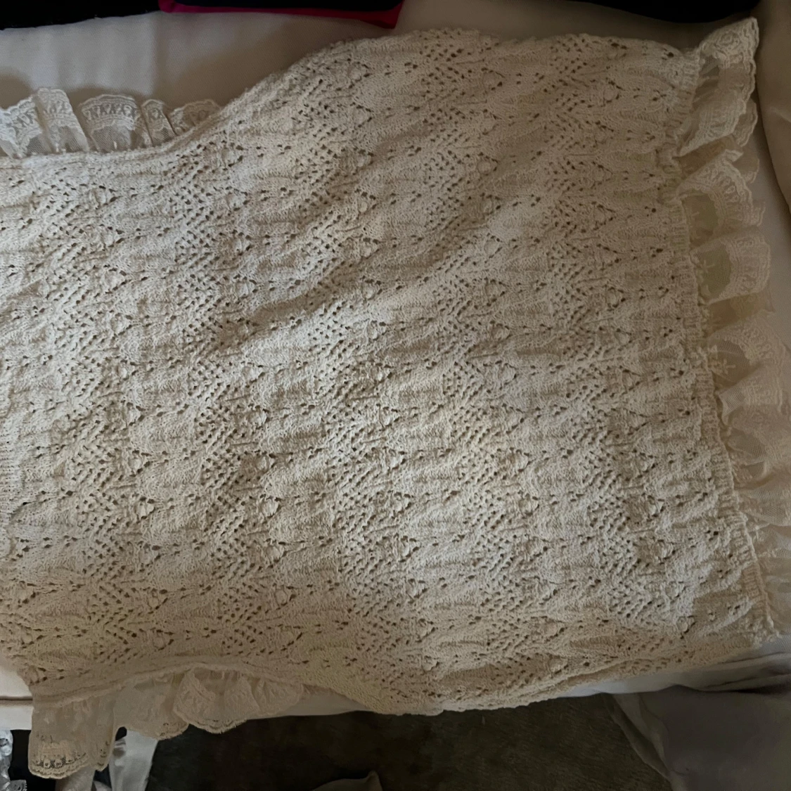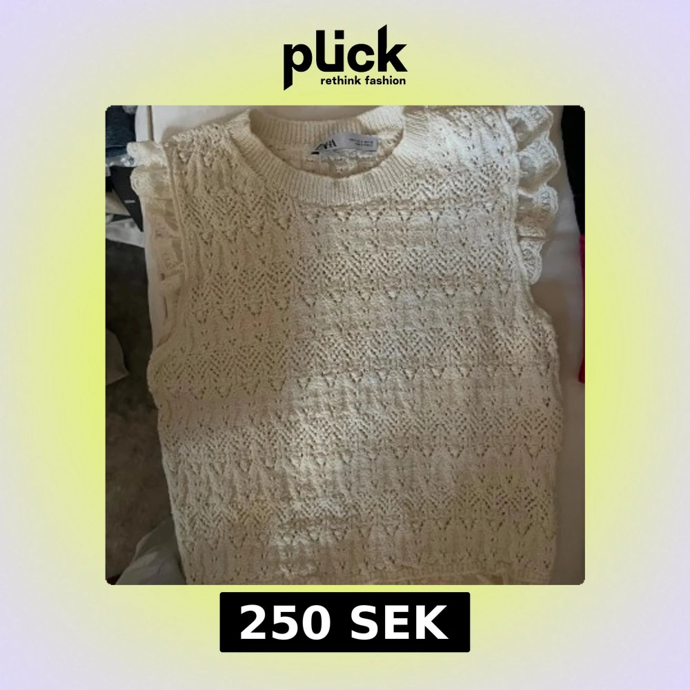 Säljer en söt vit stickad topp från Zara med volangdetaljer vid ärmhålen. Toppen har ett fint mönster och är perfekt, Passar bra till både jeans och kjol.