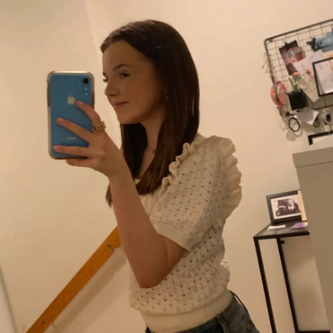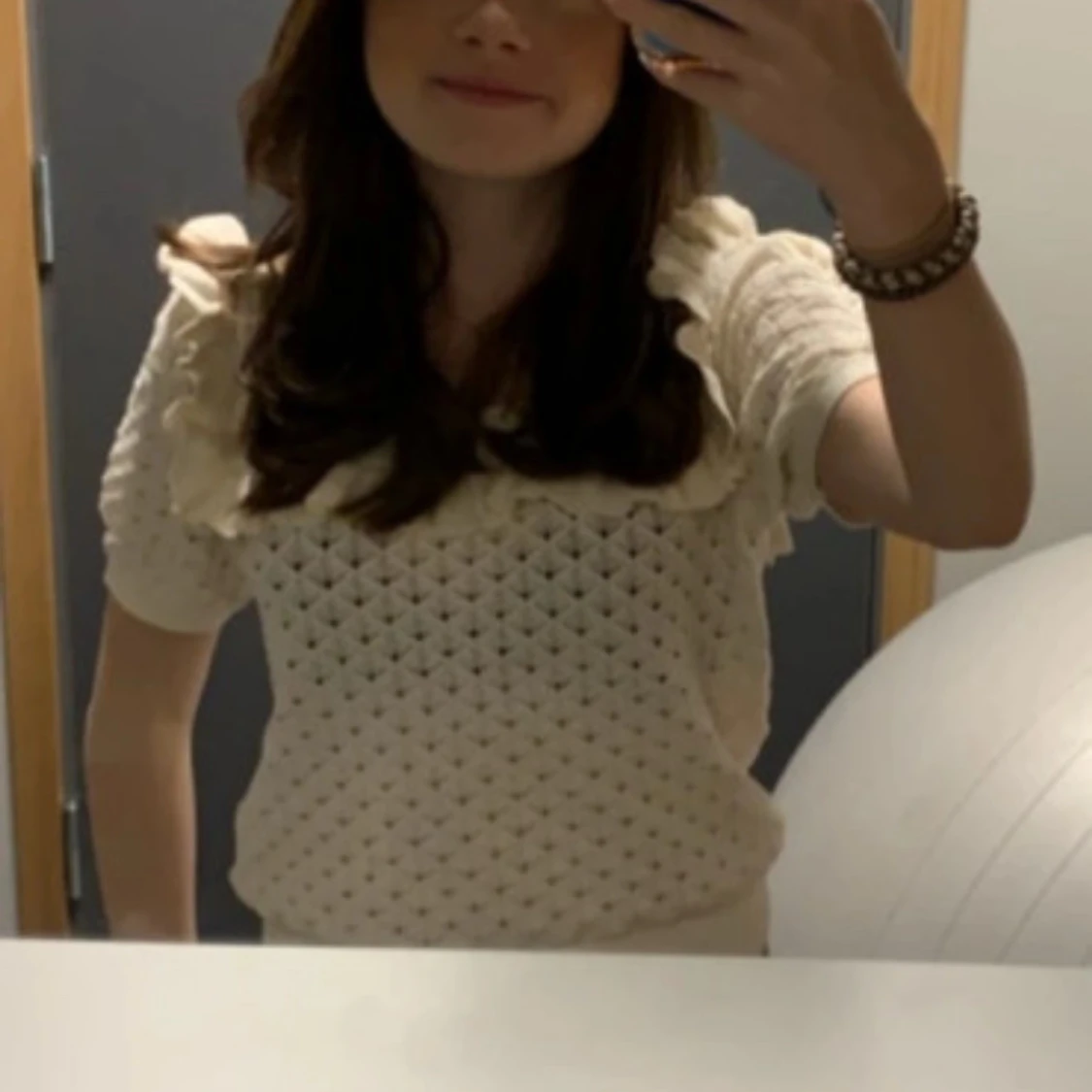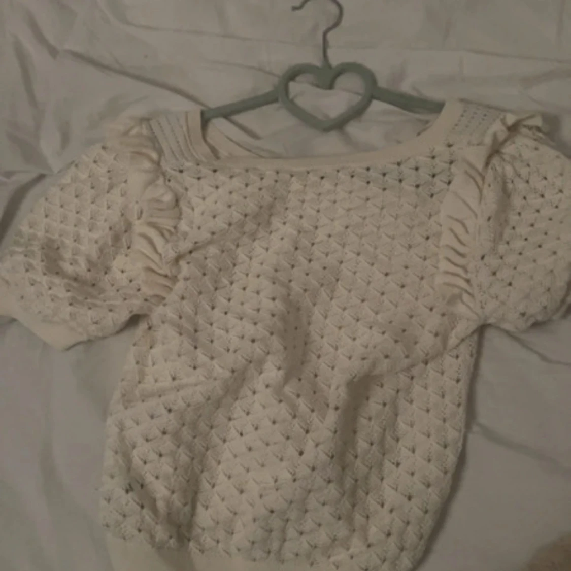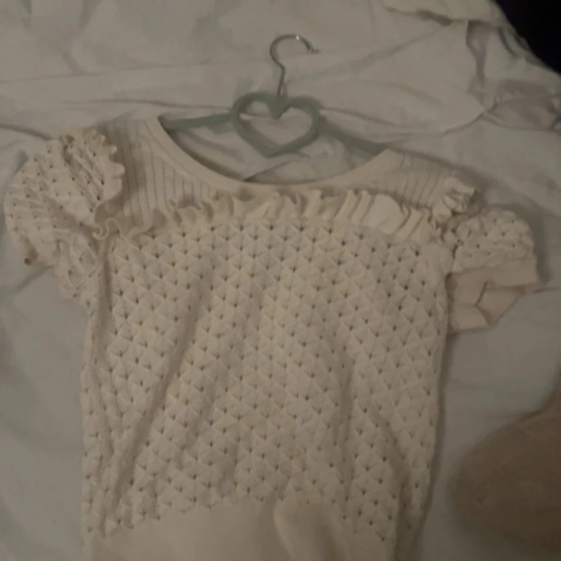 Säljer en söt vit topp med volangdetaljer på axlarna. Jätte fin att ha i vardagen eller på finare tillfällen