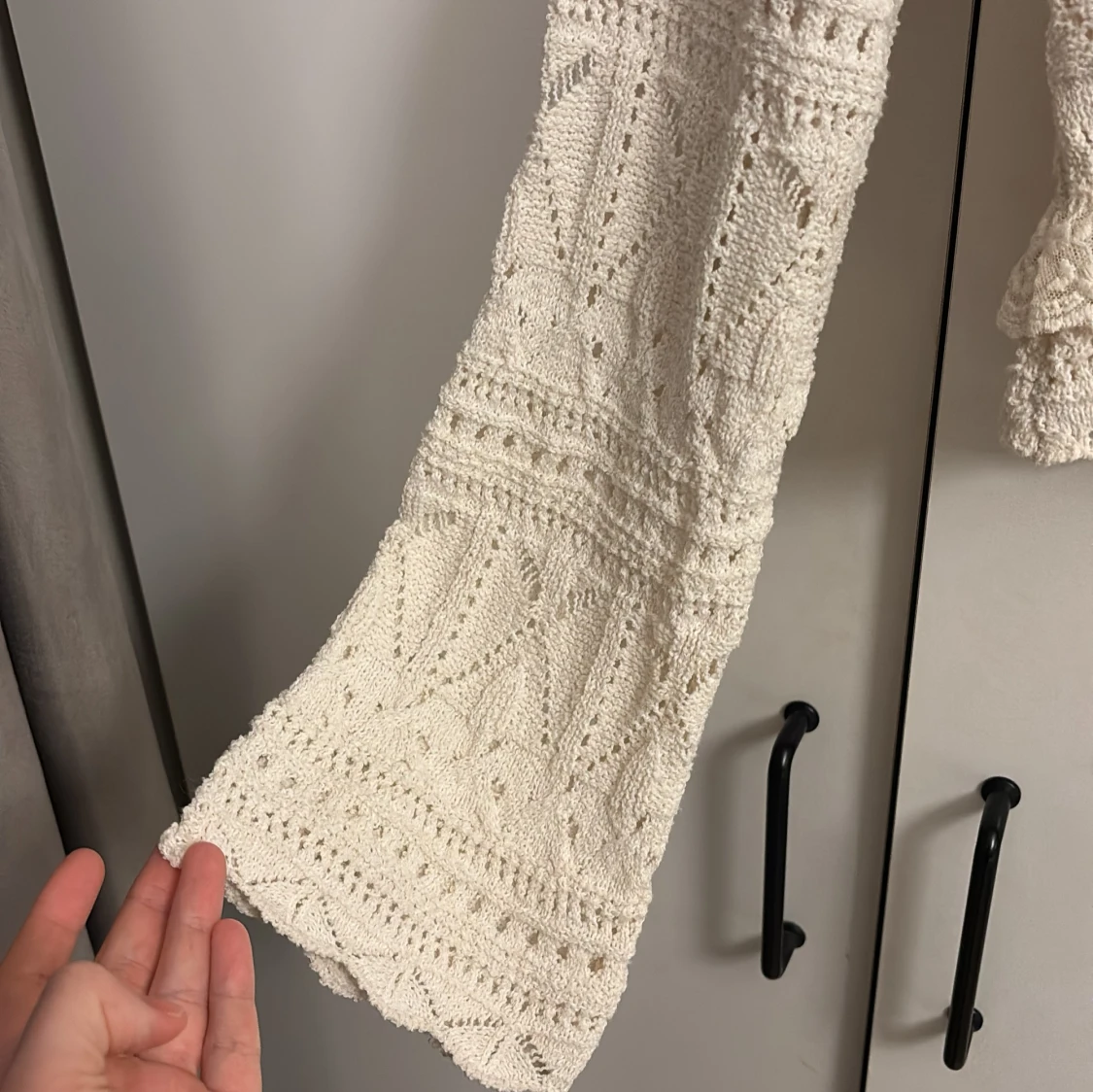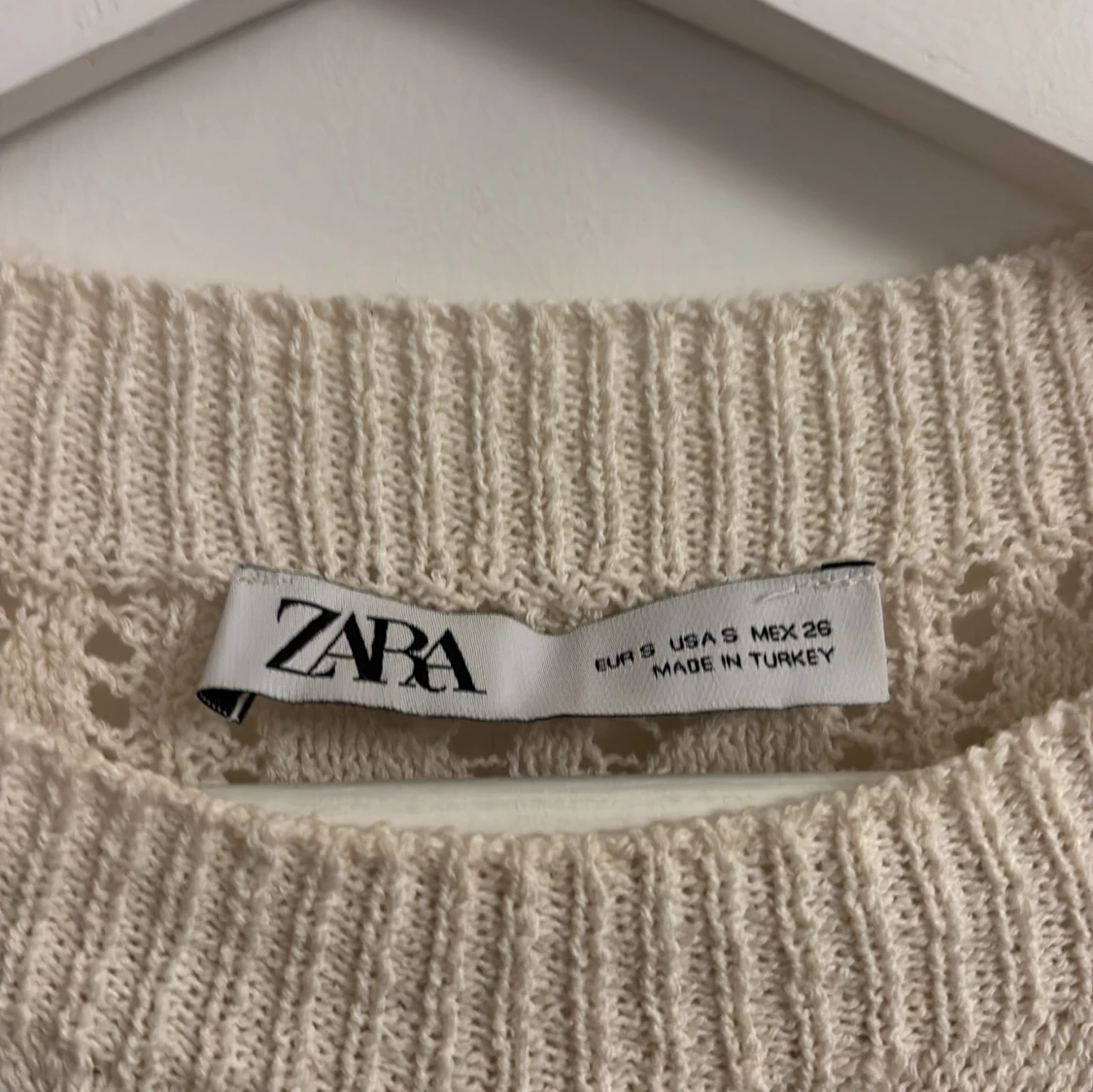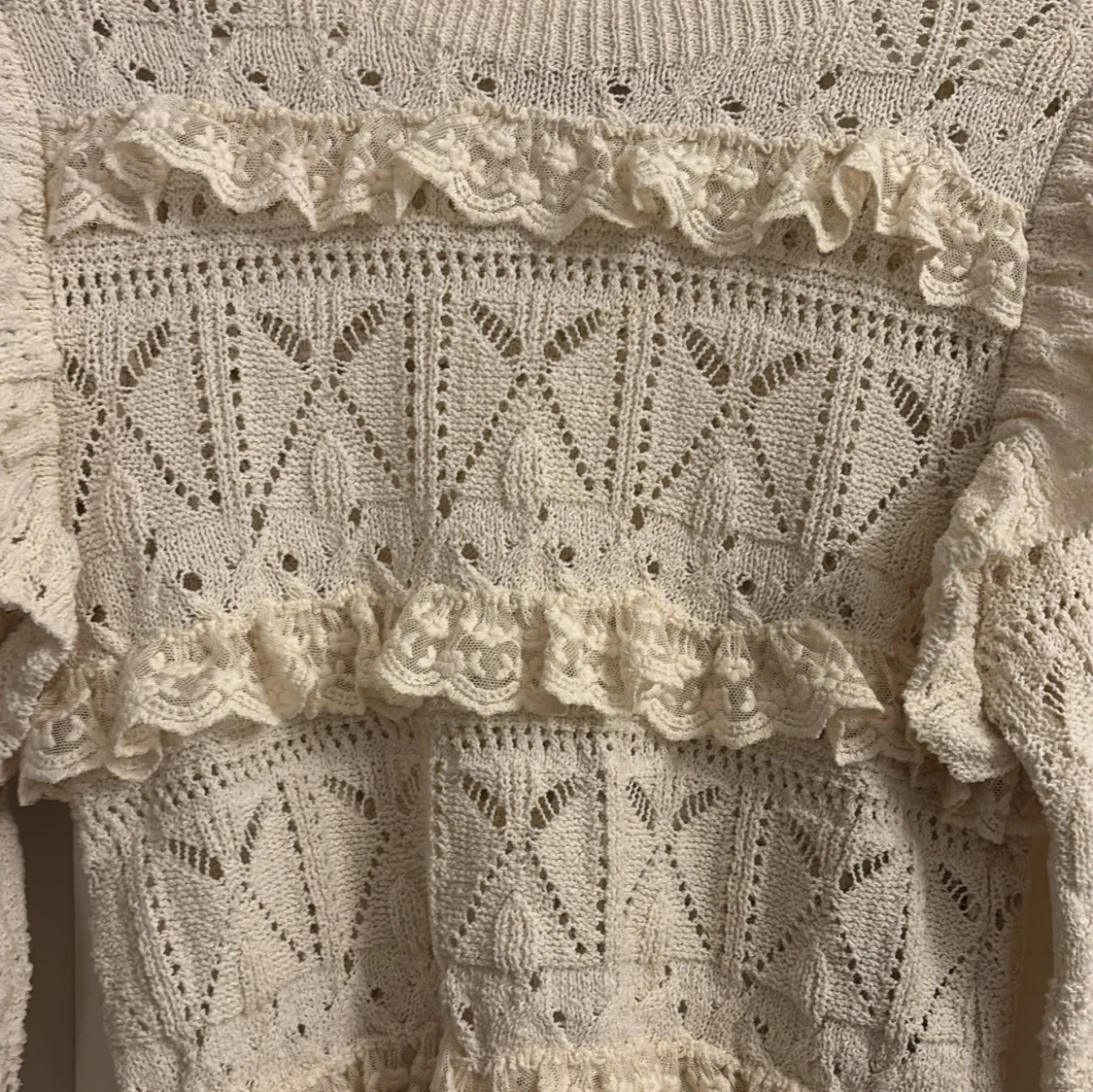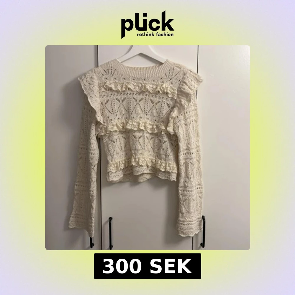 Säljer en vacker vit stickad tröja från Zara med fina spetsdetaljer och volanger. Tröjan har ett intrikat mönster och långa ärmar, perfekt för en stilfull look. Passar utmärkt till både vardag och speciella tillfällen. Tröjan har heller inga defekter!