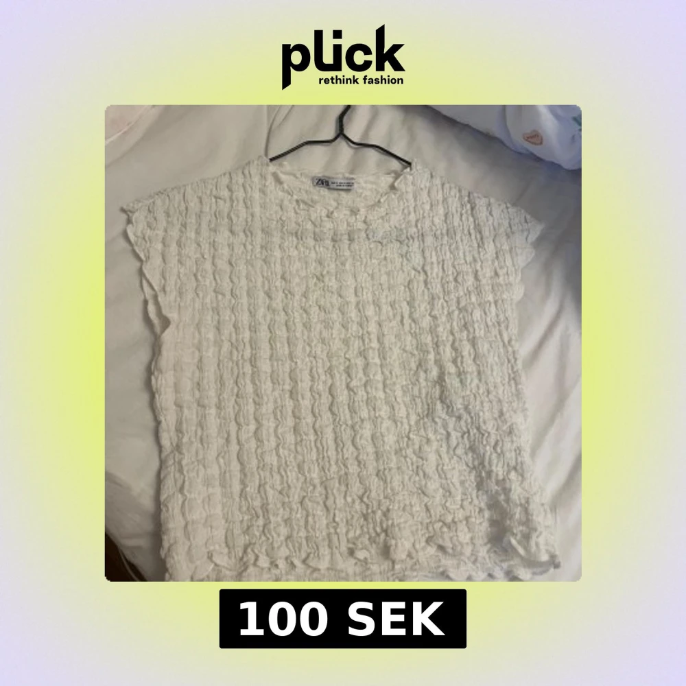 Superfin vit topp från Zara med coolt strukturerat tyg och lös passform. Toppen är ärmlös och har en lätt rynkad effekt över hela ytan som ger en unik look. Perfekt att styla med jeans eller kjol för en fräsch vibe.