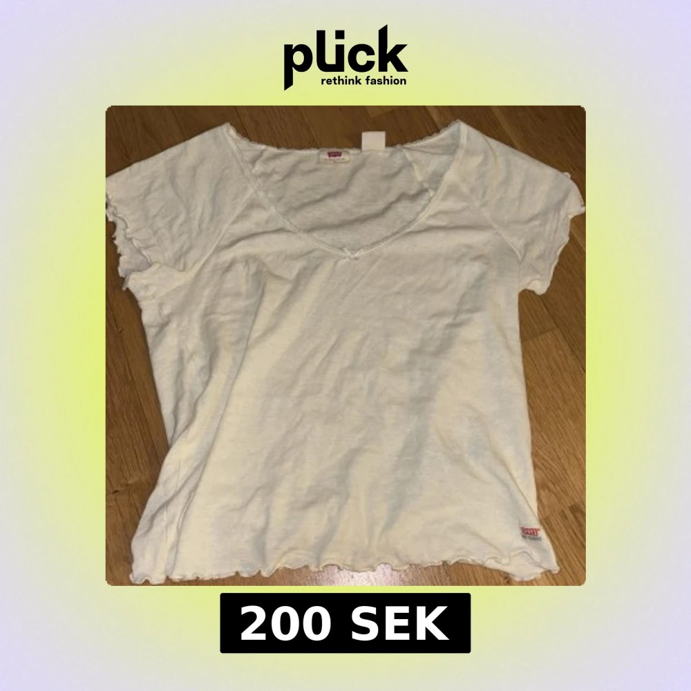 Säljer en vit t-shirt från Levi's med u-ringning och korta ärmar. T-shirten har en enkel design med vågiga kanter vid ärmslut och nederkant. Skriv om du vill ha fler bilder💞💞