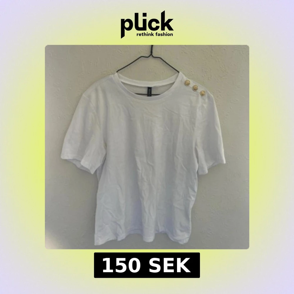 Vit t-shirt från H&M med rund halsringning och tre dekorativa guldknappar på ena axeln. T-shirten har korta ärmar och är tillverkad i mjuk bomull, perfekt för en clean och enkel stil. Endast använd en gång.